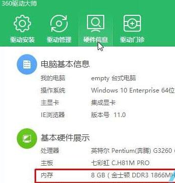 | 随着电脑的使用率越来越高,我们有时候可能会遇到对win10系统查看内存型号进行设置,如果我们需要对win10系统查看内存型号进行设置时,要如何维修win10系统查看内存型号呢? win10系统查看内存型号的详细步骤: 步骤如下: 1、首先下载并安装360驱动大师(下载地址); 2、打开【360驱动大师】,等待【正在检测程序更新...】硬件检测完毕; 3、检测完毕后点击顶部的【硬件信息】,在下面基本硬件展示方我们就可以从内存一栏中看到内存的型号了是(DDRX代表内存型号,DDR1代表1代,DDR2代表2代,以此类推)。 以上就是小编为大家介绍的windows10系统查看内存型号的具体方法了。想要查看电脑内存型号的朋友们,不妨跟着小编的步骤一步步进行操作! 是不是困扰大家许久的win10系统查看内存型号的操作方法问题已经解决了呢?方法还是很简单的,如果还有不清楚的可以参考以上的教程,希望帮助到大家。 |