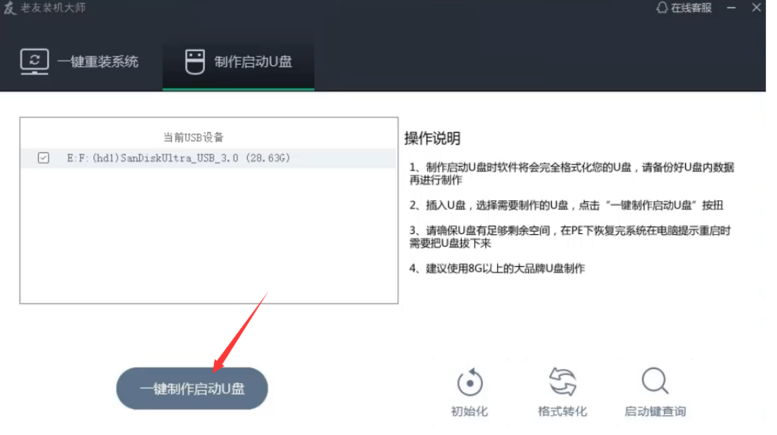 | 老友U盘重装系统如何操作呢?老友装机大师是支持U盘重装系统,这一方法相对于一键重装系统的方法比较复杂一些,适用于较为熟悉电脑的小伙伴,但操作步骤是其实不难的,下面小编就给大家带来老友U盘重装系统步骤。 工具/原料: 系统版本:Windows系统 品牌型号:宏碁(Acer)墨舞EX214 软件版本:老友装机大师3.0 方法/步骤: 使用老友装机大师U盘重装windows系统: 1、下载并安装老友装机大师到电脑上,随后插入U盘到电脑上并打开软件。 2、鼠标点击“一键制作启动u盘”。 3、耐心等待U盘启动盘制作完成后,随后拔出U盘。 4、将u盘插入另一个电脑开机后在界面选择usb选项,按回车进入pe系统,点击打开老友一键装机,点击浏览。 5、点击打开下载好的系统镜像。 6、选择我们需要安装的系统盘符,点击确定。 8、耐心等待系统安装完成后重启电脑直至进入系统桌面即老友U盘重装系统完成。 总结: 1、打开老友装机大师,插入U盘; 2、点击一键制作启动u盘; 3、U盘启动盘制作完成,拔出U盘; 4、进入pe系统耐心等待安装即可。 |