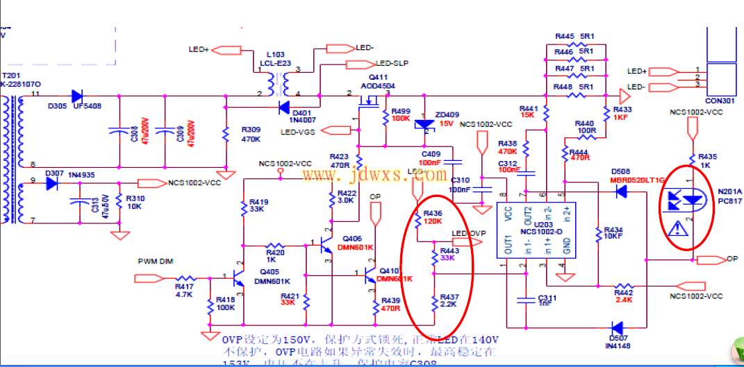 | 、工作原理是 工作原理是: 当LED+上升过压时在R436上压降增大,经R443、R437分压后使U203的2脚反向输入端电压上升,由于3脚是个2.5V的基准电压,那么1脚输出端电压降低会使D507正向导通,流过光耦N201电流增强,U202的FB脚反馈电压增高,使IC控制占空比时间,输出电压保持在稳定的阀值内。 当下降的电压小于反馈阈值时,缩短占空比时间,对输出电压进行调节。 123 / 3 页下一页 |