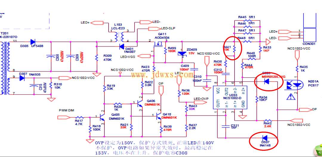 | 00 3、通过检测到R441上的电压即输出电流大于设定的值时,电流经过此电阻在⑥脚反相输入端上形成高电位,使⑦脚电位变低,二极管D508正向导通,流过光耦N201电流增强,使U202的FB脚电压增高,IC调节导通时间输出电压保持在稳定的阀值内。 当输出电流小于设定电流时,缩短占空比时间,通过这样的反馈调节机能使得输出的电压和电流都处于稳定的状态。 123 / 3 页 |
