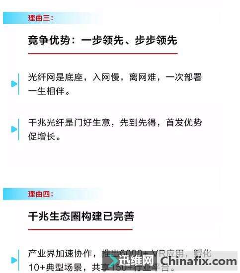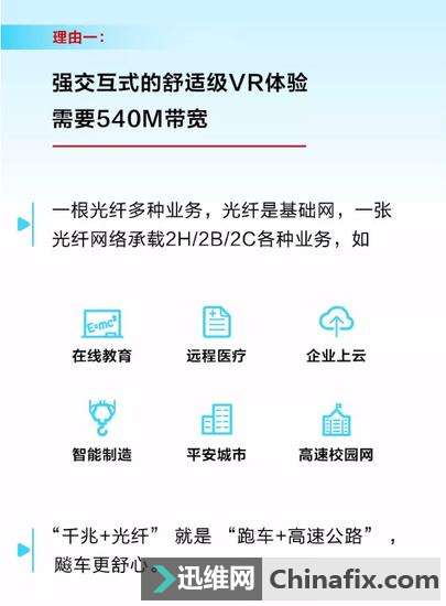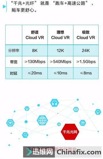 | 昨天华为网络在微信公众号发布了一篇《选择千兆光纤宽带的六大理由》,内容中提到了关于千兆宽带的优点。移动通信从最初的1FG发展到现在的5G,宽带也已经发展到了千兆宽带。 韩国某运营商通过开发VR系列极致体验内容,包括VR主题公园、360° VR IPTV平台、自建内容平台(包含体育、演唱会、旅游、游戏直播等),促进网络发展。千兆宽带占比持续提升,看来千兆宽带也很提高VR体验。 根据华为公布的数据显示: 舒适Cloud VR目标分辨率为8K,带宽要求在130Mbps以上,时延要求小于20ms;理想Cloud VR目标分辨率为12K,带宽要求在540Mbps以上,时延要求小于10ms;极致Cloud VR目标分辨率为24K,带宽要求在1.5Gbps以上,时延要求小于8ms。看来5G确实是VR所需要的一个助手,目前看来千兆宽带可以提供低延迟等优点。从韩国的千兆宽带占比中可以看出,千兆宽带将成为未来的趋势。 |