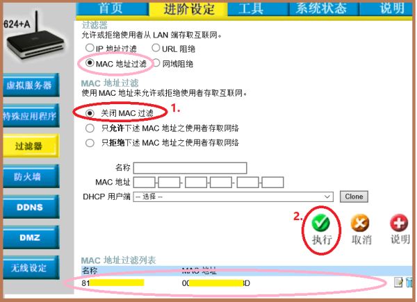 | 路由器怎么设置 路由器全部怎么安装 路由器怎么设置 路由器亮红灯哪种故障 路由器登录入口和光猫的区别 路由器怎么重启 路由器怎么连接 路由器桥接教程详细 路由器干什么用:此设备已被路由器访问控制功能阻止如何维修路由器怎样解除被限制的设备连接 一、此设备已被路由器访问控制功能阻止如何维修 您好! 针对您手机当前出现的该种情况,建议您通过以下方式处理试试的哦: ①通过手机设置->wlan->点需要连接网络->点忘记密码。 再点此网络->输入正确的密码重试(输入密码时勾选“显示密码”选项,可以看到您输入的密码);如信号是否太弱(低于②格)也无法连接。 ②关闭手机任务栏wlan开关后,再重新开启wlan并搜网连接。 ③通过手机设置->wlan->点需要连接网络右边的“>”处->使用静态ip是否为“开”,如果是,请关闭后再重启手机连接试试。 ④试试打开静态ip,手动输入ip地址、网关、网络掩码、主域名服服务器。 等信息,连接测试一下; ⑤可以进入设置>通用>恢复出厂设置-还原所有设置试下。 如果有任何问题可以随时来咨询我们的。 非常感谢您对我们vivo的支持,祝您生活愉快! 二、路由器怎样解除被限制的设备连接 1、用浏览器(或文件夹网址列)输入192.168.1.1 登入路由器设置页面。 (有的品牌是192.168.0.1) 2、找到进阶设定--过滤器页面 点选先前限制的条件(例如此例中的”MAC地址过滤“) 点选【关闭MAC过滤】--执行--退出浏览器。 注:如确定日后不再限制该设备,也可将底下的过滤列表一并删除。 ----------------------- (如需重设其他设置,可参考另一答复 http://zhidao.baidu.com/question/174182633文中有详细图解) 各品牌路由器设置不尽相同,请斟酌参考。 |