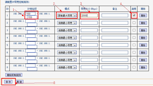 | 1、打开TP-LinkTL-WR886N路由器的Web管理界面:在浏览输入192.168.1.1后输入用户名和密码登陆。(注:默认密码:Admin) 2、进入后,检查DHCP服务器的IP地址池,点击左侧导航栏的【DHCP服务器】按钮,并记住地址池的开始地址和结束地址。 3、然后开启“IP宽带控制”功能并设置参数:点击左侧导航栏的【IP宽带控制】,勾选开启“IP宽带控制”,在“请填写您申请的带宽大小”后面填写你的宽带最大值(1M=1000KB) 4、在“IP地址段”填写上DHCP服务器地址池的开始地址和结束地址--->在“模式”下面选择“限制最大带宽”--->在“宽带大小”列填写允许使用的最大带宽--->在“启用”列下勾选对应的方框--->点击“保存”。 5、重启路由器。左侧导航栏,点击【系统设置】,然后点击【重启路由器按钮】,待重启好后就生效了。 |