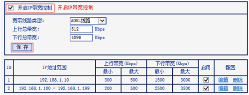 | 1、V1版本TL-WR881N路由器:在浏览器中输入:192.168.1.1——>“用户名”、“密码”都输入:admin——>点击“确定”,登录到设置界面。 2、V2版本TL-WR881N路由器:在浏览器中输入192.168.1.1 或者 tplogin.cn——>输入“管理员密码”,登录到设置界面。 3、点击“IP宽带控制”——>“宽带线路类型”选择:ADSL——>“上行总带宽”填写:512——>“下行总带宽”填写:4096——>点击“保存”。 4、点击“添加条目”——>“起始地址”、“结束地址”都填写:192.168.1.10——>“上行最小带宽”填写:300——>“上行最大带宽”填写:500——>“下行最小带宽”填写:1500——>“下行最大带宽”填写:3000——>点击“保存”。 5、点击“添加新条目”——>在“起始地址”填写:192.168.1.100——>“结束地址”填写 192.168.199——>“上行最小带宽”填写:200——>“上行最大带宽”填写:500——>“下行最小带宽”填写:2500——>“下行最大带宽”填写:3500——>点击“保存”。 6、勾选“开启IP宽带控制”——>点击“保存”。 |