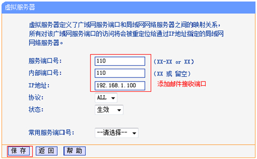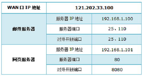 | 1、实例列举:某小型企业使用TL-WR886N路由器连接上网,并且在内网中搭建了Web、FTP、Mail等服务器。但是Internet上的用户,无法访问到内容中的Web、FTP、Mail等服务器,这时候可以在TL-WR886N路由器上,设置虚拟服务器来解决。 2、需求分析:需要把Web、FTP、Mail服务器的IP地址设置为固定IP地址,然后还需要弄清楚Web、FTP、Mail服务所使用的端口号,详细信息如下图所示。 3、TL-WR886N上设置虚拟服务器 (1)检查服务器相关设置 ①服务器的IP地址,要设置为固定IP地址,网关为TL-WR886N路由器的LAN口IP地址,如下图所示。 ②建议关闭服务器(电脑)上的防火墙、杀毒软件。 ③确认局域网内的其它电脑,可以通过服务器的IP地址访问相应的服务。 (2)登录到TL-WR886N管理界面——>点击“转发规则”——>“虚拟服务器”——>并点击“添加新条目”。 4、填写邮件服务器的“服务端口号”(对外开放端口)——>“内部端口号”(服务器实际端口)——>“服务器IP地址”——>然后点击“保存”。发送邮件(SMTP:25号端口): 接收邮件(POP3:110号端口): 温馨提示:“服务端口号”服务端口号为对外开放端口,即Internet访问服务器使用的端口。 5、添加网页服务器规则。 温馨提示:服务端口号可以根据需要自行设置(如需更改,建议设置为9000以上)。无特殊需求,请将服务端口号与内部端口号一致。 6、点击“转发规则”——>“虚拟服务器”,如下图所示表示创建成功。 7、根据以上设置,Internet中的客户端通过邮件客户端软件访问121.202.33.100(WAN口IP地址),即可访问到邮件服务器。通过浏览器访问网页服务器,访问形式如下: 温馨提示:如果您的宽带并非静态IP地址,可以在“动态DNS”中申请域名账号并在路由器中登录该账号,登录后使用您的域名和开放的端口号访问服务器。 |