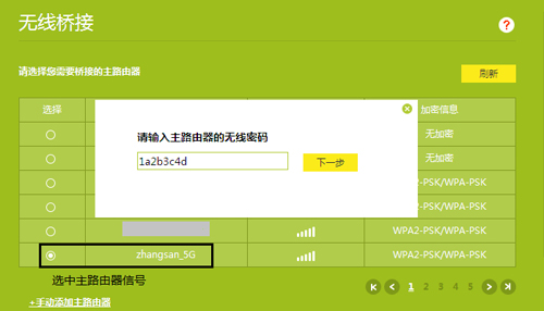 | 1、确认需要桥接的信号参数,即主路由器的无线信号名称、无线密码,以下仅做本文举例: 注意:无线桥接(WDS)的所有操作均在副路由器完成,无需设置主路由器。 2、电脑连接到副路由器的LAN口或无线信号,并使用tplogin.cn登录管理界面。 3、点击 应用管理,如下: 4、找到无线桥接,点击 进入: 5、进入无线桥接设置向导后,点击 开始设置,如下: 6、路由器自动扫描周边无线信号。 7、选择扫描到的主路由器信号,并输入主路由器的无线密码,点击 下一步: 注意:如果扫描不到主路由器的信号,确认主路由器开启无线功能,且尝试减小主、副路由器之间的距离。 8、主路由器会给副路由器分配一个IP地址,用于后续管理路由器,建议记下该IP地址,点击 下一步。 9、设置副路由器5G信号的无线网络名称和无线密码,点击 下一步,如下: 注意:此处可以设置副路由器的无线参数,但是如果要实现无线漫游,则必须保持不变。 10、再次进入 应用管理 >> 无线桥接 中,可以看到桥接状态为 桥接成功。如下: 至此无线桥接(WDS)设置完成,无线终端连接zhangsan_5G,有线电脑连接主、副路由器的LAN口即可上网。终端移动过程中,可以实现主、副路由器间的自动漫游。 |