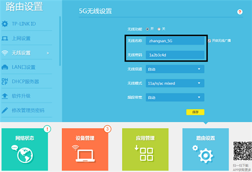 | 1、电脑使用网线连接路由器的LAN口或者使用无线连接路由器的无线信号,打开浏览器,清空地址栏,输入tplogin.cn(或192.168.1.1),填写管理密码,登录管理界面。 注意:管理密码是初次登录路由器时设置的6-15位密码,如您已经忘记,请复位路由器并重新设置。 方法一、在首页查看和修改:登录管理界面后,在页面左上侧会有 网络状态,此处可以分别管理2.4G和5G网络的 名称、密码,如下: 方法二、在无线设置中查看和修改 在 路由设置 > 无线设置 中可以查看或修改设置,如下: 设置2.4G网络的名称和密码: 设置5G网络的名称和密码: 此处可以修改无线信道、模式或频段带宽。 重要提示:如果您仅修改了无线密码而没有修改名称,那么已经连接过该无线信号的终端无法自动连接上信号,必须删除终端上保存的无线配置文件,重新连接。参考删除无线配置文件的方法。 如果改了信号名称,则正常连接即可。 |