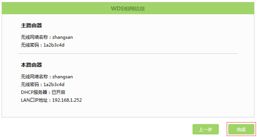 | 1、电脑连接副路由器,登录路由器管理界面,点击 高级设置,如下图: 2、点击 无线设置2.4G >> WDS无线桥接,如下图: 3、点击WDS无线桥接中的 下一步,开始设置,如下图: 路由器会自动扫描周边信号,找到主路由器的信号,点击 选择。如下图: 注意:可能不止一页,可以点击进入到下一页。如果无法扫描到主路由器信号,请减小路由器之间的距离或障碍物。 4、路由器自动提示输入主路由器的无线密码,请正确输入,并点击 下一步,如下图: 5、扫描并连接主路由器信号后,设置本路由器2.4G信号的无线网络名称和无线密码,并点击 下一步,如下图: 注意:如果不需要实现无线漫游,可以将本路由器的无线名称及密码设置为与主路由器不一样。 6、修改本路由器LAN口IP地址,将本路由器的LAN口IP地址修改为与主路由器在同一网段且不冲突,并点击 下一步,如下图。 7、确认配置信息正确,点击 完成,设置完成。如下图: 观察右上角WDS状态,已连接 表示WDS桥接成功。如下图: 注意:该页面参数无需设置,仅在后续网络变动时做修改。 8、点击 网络参数 >> DHCP服务器,关闭DHCP服务器,如下图。 至此无线WDS桥接设置完成,副路由器下的无线终端连接到zhangsan,即可正常访问网络。终端移动过程中,可以实现主、副路由器间的自动漫游。 |