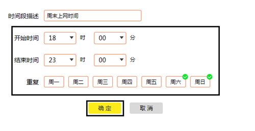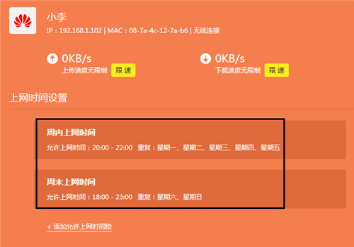 | 1、在浏览器输入tplogin.cn登录路由器管理界面,点击 设备管理,进入管理设置页面,如下图: 2、找到待控制主机,该页面有多个终端,找到待控制的终端,如下: 3、修改主机名称,点击终端名字,修改为常用名便于管理。然后点击 上网时间设置,如下: 4、添加允许上网的时间段,以本例为准,添加周内和周末两个上网时间段。如下: 5、添加之后列表如下: 6、您也可以控制其他终端的上网时间,如下: 至此,上网时间控制设置完成,小李只能在允许的上网时间段上网。 |