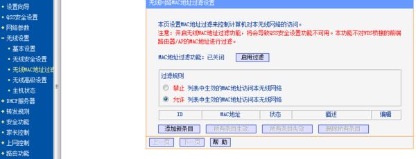 | 路由器怎么设置 路由器全部怎么安装 路由器怎么设置 路由器亮红灯哪种故障 路由器登录入口和光猫的区别 路由器怎么重启 路由器怎么连接 路由器桥接教程详细 路由器干什么用:无线路由器怎么设置过滤mac地址如何设置无线路由器mac地址过滤 一、无线路由器怎么设置过滤mac地址 1 MAC地址是连网的终端在网络上的唯一标识。 2 通过过滤MAC地址,可以设置允许某些MAC地址通过路由器登陆网络。 而未设置的全部被拦截。 3 也可以通过过滤MAC地址设置拦截某些MAC地址,而未设置的全部允许通过。 4 当电脑连网后,可以在路由器DHCP服务列表里查看所有连网的终端的MAC地址和匹配的IP。 5 记录需要允许的终端的MAC地址后,进入无线设置-无线MAC地址过滤-选择启用过滤,选择是允许还是禁止 列表中生效的MAC地址访问本无线网络-然后添加新条目中输入记录的MAC地址。 状态为生效后保存。 二、如何设置无线路由器mac地址过滤 1、无线路由器插上电,先不要接猫,电脑连接无线路由器任一LAN口 ; 2、 浏览器地址栏输入路由器IP地址(路由器背后标签上有的),输入登录用户名和密码进入设置页面; 3、点击无线配置,可以看到无线Mac地址过滤选项。 4、选中无线Mac地址过滤选项,将过滤状态调为开启,过滤规则调为允许,然后点击保存生效,此时已经开启了Mac地址过滤功能。 5、接下来,将你想要添加的设备连入该无线路由器,打开网络参数——内网配置选项。 6、在DHCP 客户端列表中复制你想加入设备的Mac地址。 7、打开无线配置——无线Mac地址过滤选项,在Mac地址栏中填写复制的Mac地址,点击增加,此时,便将该Mac地址加入了路由器。 |