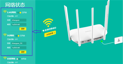 | 1、操作电脑使用网线连接副路由器的LAN口或者使用无线连接副路由器的无线信号。打开浏览器,清空地址栏,输入tplogin.cn(或192.168.1.1),填写管理密码,登录管理界面。如下: 注意:管理员密码是首次使用路由器时设置的密码,如忘记,请复位路由器并重新设置。 2、进入管理界面后,点击“应用管理”,在已安装应用中找到“无线桥接”,点击“进入”。如下: 3、进入无线桥接设置向导后,点击“开始设置”。如下: 4、路由器自动扫描周边无线信号。如下: 5、选择扫描到的主路由器信号,并输入主路由器的无线密码。如果主路由器支持2.4G和5G频段,建议选择5G信号。点击“下一步”: 注意:如果扫描不到主路由器的信号,确认主路由器开启无线功能,且尝试减小主、副路由器之间的距离。 6、记录前端主路由器分配的IP地址,主路由器会给副路由器分配一个IP地址,用于后续管理路由器,建议记下该IP地址。点击“下一步”: 7、确认副路由器的无线名称及密码,直接点击“完成”: 注意:此处可以设置副路由器的无线参数,但是如果要实现无线漫游,则必须保持不变。 8、确认无线桥接成功,再次进入“应用管理>无线桥接”,可以看到桥接状态为“桥接成功”。如下: 至此无线桥接(WDS)设置完成,无线终端连接zhangsan,有线电脑连接主、副路由器的LAN口即可上网。终端移动过程中,可以实现主、副路由器间的自动漫游。 WDS桥接成功后,双频路由器作为副路由器桥接主路由器,在无线桥接过程中我们只配置了一个频段的无线信号名称和密码,还需要配置另外一个频段。比如使用5G频段桥接,就需要单独设置2.4G的无线信号,反之一样。点击“网络状态”修改相关设置,如果主路由器也是双频路由器,请将信号名称和密码设置与主路由器一致,以实现漫游: 至此无线桥接(WDS)设置完成,最终的网络效果图如下: 主、副路由器支持的2.4G、5G信号都可以连接使用,而且只要同一频段的信号名称和密码一致,则可以自动漫游。有线电脑使用网线连接主、副路由器的任意一个LAN口即可上网。 |