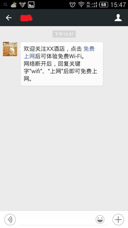 | 1、登录路由器管理界面,点击 广告营销 >> 认证设置: [1] 认证方式设置,认证方式选择“微信认证”。如下图: [2] 设置认证跳转链接,该链接用于认证上网,在认证链接的尾部填写1-20位的标识,生成的认证跳转链接如下图: 请复制该跳转链接,后续步骤需要。 [3] 设置微信认证提醒页面,该页面为无线客户端连接无线网络后,浏览器中弹出提醒客户关注微信的页面,如下: [4] 设置微信认证跳转页面,此页面为客户关注微信公众号之后,点击“免费上网”之后跳出的页面。 注意:微信认证跳转页面的内容来源,也可以选择广告页面,需要在“广告制作”中制作。 2、微信后台添加跳转,以订阅号为例,微信后台设置如下: [1] 添加自动回复消息,将跳转链接http://weixin.tplogin.cn:8080/wechat_auth.html?test添加到微信后台自动回复信息中: 注意:需要将超链接以html语言的格式加到免费上网中,在该语句前面最好增加一个空格或者“:”,如上述例子中,在“点击”处增加一个空格。 [2] 关键字推送设置,将链接http://weixin.tplogin.cn:8080/wechat_auth.html?test添加到自动回复中,如下: 3、微信认证设置完成,下面我们尝试关注微信并认证上网。 [1] 连接无线信号,终端(手机)连接无线网络后,跳出认证提醒页面(部分Android手机需要打开浏览器),如下: [2] 关注微信号,使用手机关注对应的微信公众号,如下: [3] 点击“免费上网”,点击“免费上网“后,无线终端就可以免费上网。 如果下次需要接入该无线网络上网,请在该微信公众号中输入包含“上网”的相关词语(如“上网”“WiFi”等),收到免费上网消息后,点击后即可上网。具体相关词可以在微信后台设置。 以上为微信认证、体验的设置方法与效果。 |