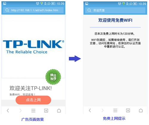 | 1、如果您的广告图片存储在手机上,或者需要现场使用手机拍照,可以通过手机APP快速制作广告。本文介绍具体设置方法。制作之前,请扫描并下载“TP-LINK广告路由”APP,如果已经下载安装,则可以开始制作: 2、打开APP并登录页面,确认手机已连接员工无线网络的无线信号,点击已安装的“TP-LINK广告路由”,进入登录界面。初次登录需要设置管理员密码,点击登录。 注意:若无线终端连接到广告无线网络,将无法管理路由器。 3、广告制作,进入编辑页面,打开APP之后,开始添加广告并选择内容来源为模板编辑,如下: 4、页面编辑,按照以下流程进行模板选择、图片添加、文字编辑,您还可以添加预置图标、设置特效等处理。如下: 注意:本例不介绍图标、特效、调色,您可以根据需要进行设置。 该路由器支持制作三个广告页面。若同时启用多个广告,路由器将会按照设定的广告轮播间隔轮流的播放各个广告。 5、广告时间参数设置,点击预览页面左上角的按键,设置广告时间,具体参数介绍如下: 广告倒计时:广告页面停留时间,如果您的广告页面内容比较丰富,可以停留更长时间。 免费上网时间:观看一次广告后可以持续的上网时间,超过该时间限制后页面会再次弹出广告。 空闲断线时间:如果用户再该时间内没有上网,路由器将断开此用户的连接。 广告轮播间隔:添加多页广告时,不同广告循环播放的时间间隔,比如此时为第一条,60分钟后后弹出的是第二条,依次循环切换。 6、广告效果体验:使用无线终端连接广告无线网络的无线信号,无线连接成功后就会自动弹出广告。广告倒计时结束后会出现点击上网按钮,如下图。 注意:如果个别Android手机没有自动弹出广告页面,建议手动打开浏览器触发弹出广告。 点击点击上网,跳出免费上网的提示欢迎页面,说明您可以开始上网了。 至此,广告制作及推送完成。 |