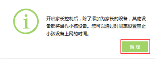 | 步骤一、添加家长电脑 1、进入家长控制 登录路由器管理界面,点击 高级设置,进入设置界面,如下图: 点击 上网控制 >> 家长控制,如下图: 2、添加家长电脑 点击 添加,如下图: 在添加栏中选择家长电脑,选择家长电脑的MAC地址,点击 保存。如下图: 注意:家长电脑上网无任何时间限制。 注意:如果家长有多台电脑或者手机,请逐一添加。 家长电脑添加完成后,如下列表: 步骤二、设置小孩上网时间段 添加允许小孩上网的时间段,空白区域为允许上网的时间。如下图: 注意:本例中允许小孩在周内19:00~22:00点、周末08:00~23:00上网,具体设置依据实际需求。 步骤三、启用家长控制 在页面上方点击开启家长控制,如下图: 在弹出的对话框中点击 确定,如下图: 至此,家长控制功能设置完成。家长上网不受任何限制,小孩只能在指定时间上网。 |