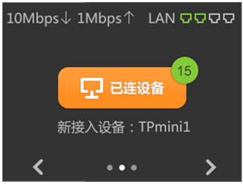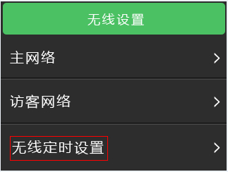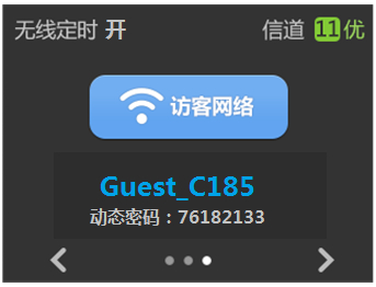 | 步骤一:修改无线参数 1、进入设置界面 在默认主视图,点击 设置,如下图: 点击 无线设置,如下图: 2、设置主网络无线参数 点击 主网络 设置无线网络,如下图: 设置主网络的无线名称(SSID)、无线密码,如下图所示: 设置好以上内容后,使用触控笔向下拉动页面设置其他内容,如下图: 3、设置访客网络 返回到主菜单,点击 访客网络,访客网络默认开启,可以根据需要设置是否开启访客网络及设置访客名称,无线的密码周期(自动变化)如下图所示: 4、无线定时设置 无线定时设置可以设置无线特定时间段关闭路由器的无线,如下图: 如果您需要设置无线定时,请点击并添加时间段和对应星期,可以进行增删,如下图: 至此,无线设置完成。笔记本、手机可以搜索信号并连接上网。 步骤二:查看访客密码 1、进入主界面 进入主界面,如下图: 2、切换到访客网络界面 向右点击箭头,切换到 访客网络 界面,如下图: 在该界面查看访客网络的动态密码,需要接入访客网络的终端输入该密码即可,如下图: 注意:访客网络的动态密码按照之前设置的更新周期变化。 步骤三:观察无线状态 1、进入主界面 进入主界面,如下图: 2、切换到无线状态 向右点击箭头,切换到无线状态页(第二页),如下图: 在该界面查看已连接的无线设备和对应状态,如下图: 点击 已连设备,可以对已经连接的无线设备观察和管控,如下图: 可以观察无线终端的名称、无线速率、MAC地址、IP地址,点击 禁用 即可禁止该设备连接无线网络。如下图: |