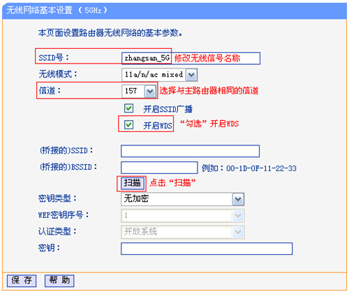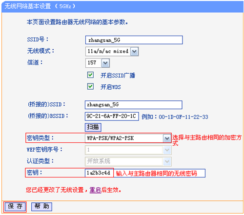 | 第一步:确认主路由器无线参数 确认主路由器的无线信号名称、无线密码以及无线信道,本文使用以下参数举例: 注意:无线桥接(WDS)的主要操作均在副路由器完成,只需固定主路由器的无线信道。 第二步:设置副路由器 1、修改管理IP地址 登录到路由器的管理界面,点击 网络参数 >>LAN口设置,修改IP地址(如主路由器的IP地址是192.168.1.1,则副路由器修改为192.168.1.2),保存并重启路由器。 注意:重启后使用修改后的IP地址登录路由器管理界面。 2、修改无线参数并开启WDS扫描信号 使用修改后的IP地址登录路由器管理界面,点击 无线设置5GHz >> 无线基本设置,修改与主路由器相同的SSID号 及 信道,勾选开启WDS,点击 扫描。 3、选择主路由器信号 在扫描页面中找到主路由器的SSID,点击 连接。 注意:如果扫描不到主路由器的信号,请确认主路由器开启无线功能,且尝试减小主、副路由器之间的距离。 4、选择加密方式并输入无线密码 密钥类型选择与主路由器相同的 加密方式,在 密钥 位置输入主路由器的无线密码,完成后点击 保存。无需重启路由器,继续下一步设置。 5、设置副路由器的无线密码 点击 无线设置5GHz >> 无线安全设置,选择与主路由器相同的加密方式,在 PSK密码 中设置与主路由器相同的无线密码,点击保存。无需重启路由器,继续下一步设置。 注意:副路由器的SSID、无线密码可以与主路由器不同,如果需要实现漫游,则必须与主路由器相同。 6、关闭DHCP服务器 点击 DHCP服务器 >> DHCP服务,将DHCP服务器选择为 不启用,点击 保存。系统提示重启后生效,点击 重启。 第三步:确认桥接成功 重启完成后,在回路由器的管理界面,点击 运行状态,观察 无线状态5GHz >> WDS状态,显示 成功 则表示桥接WDS设置成功。 至此无线桥接WDS设置完成,无线终端连接zhangsan_5G即可正常上网。终端移动过程中,可以实现主、副路由器间的自动漫游。 注意:无线桥接(WDS)设置完成后,副路由器只需通电即可,无需其他设置。 |