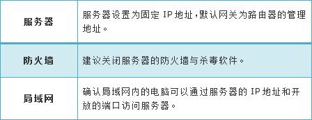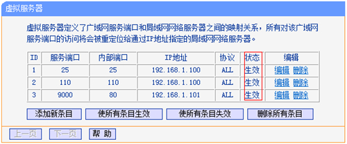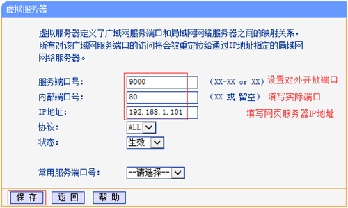 | 第一步:确认服务器搭建成功 设置虚拟服务器之前,需要确认以下几点: 第二步:添加虚拟服务器规则 1、开始设置 登录路由器管理界面,进入 转发规则 >> 虚拟服务器,并点击 添加新条目。 2、添加邮件服务器规则 填写邮件服务器的服务端口号(对外开放端口)、内部端口号(服务器实际端口)、服务器IP地址,然后点击 保存。 发送邮件(SMTP:25号端口): 接收邮件(POP3:110号端口): 服务端口号:服务端口号为对外开放端口,即Internet访问服务器使用的端口。 3、添加网页服务器规则 注意:服务端口号可以根据需要自行设置(如需更改,建议设置为9000以上)。无特殊需求,请将服务端口号与内部端口号一致。 4、确认规则启用 进入 转发规则 >> 虚拟服务器,如图所示表示创建成功。 至此,虚拟服务器规则设置完成。 第三步:确认服务器设置成功 根据以上设置,Internet中的客户端通过邮件客户端软件访问121.202.33.100(WAN口IP地址),即可访问到邮件服务器。通过浏览器访问网页服务器,访问形式如下: 注意:具体的访问形式以实际服务器要求为准。 如果您的宽带并非静态IP地址,可以在 动态DNS 中申请域名账号并在路由器中登录该账号,登录后使用您的域名和开放的端口号访问服务器。 |