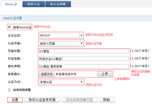 | 第一步:WEB认证配置 登录路由器管理界面,点击 认证管理 >> 认证设置 >> Web认证,具体设置如下: 注意:认证方式若选择为“一键上网”,则无需第二步“新增用户”。 第二步:新增用户 点击 认证管理 >> 用户管理 >> 本地用户,点击 新增,如下: 用户设置如下: 添加完成用户后,即可开始验证认证效果。 第三步:连接无线上网 [1] 连接无线信号 无线终端(手机)连接无线网络后,跳转到认证登录页面(部分Android手机需要打开浏览器),如下: [2] 登录上网 输入用户名、密码,点击 登录 后,无线终端就可以免费上网。 至此,Web认证设置完成,无线终端只需要连接Wi-Fi信号,输入对应的认证用户名密码即可上网。 如果您想查看通过认证的终端列表,可以点击 认证管理 >> 认证状态,如下: |