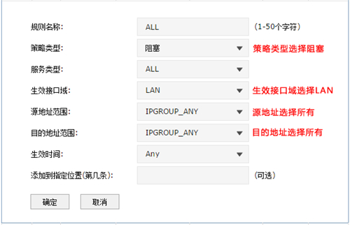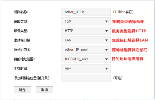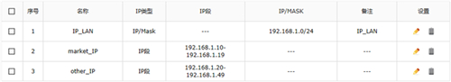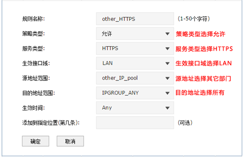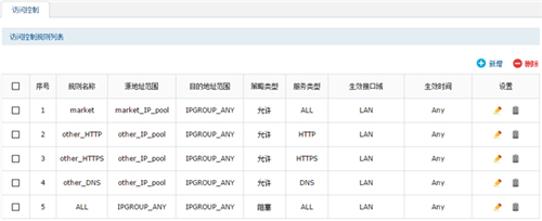| 1、设置市场部和其它部门的地址组 添加地址 点击“对象管理>地址管理>地址”,点击+新增,添加市场部的IP地址段,如下图: 同样的方法,添加其它部门的IP地址段,添加后列表如下: 添加地址组 点击“对象管理>地址管理>地址管理”,点击+新增,添加市场部的地址组,如下图: 同样的方法,添加其它部门的地址组,添加后地址组列表如下: 2、新增服务类型 点击“对象管理>服务类型”,点击+新增,添加HTTPS服务,如下图: 3、设置访问控制 设置市场部规则 点击“安全管理>访问控制”,点击+新增,添加策略规则:允许市场部访问所有网络应用,如下图所示: 设置其它部门规则 其它部门的员工,只允许浏览网页,即需要开放HTTP、HTTPS、以及DNS服务,添加规则如下: 设置阻塞规则 由于访问控制规则默认为“允许”,所以需要再添加禁止访问一切的规则才可以实现需求,规则如下: 添加完成后,规则列表如下: 设置完成,点击右上角“保存配置”。 至此,访问控制设置完成,局域网中所有电脑将拥有所属的部门对应的上网权限。 |
