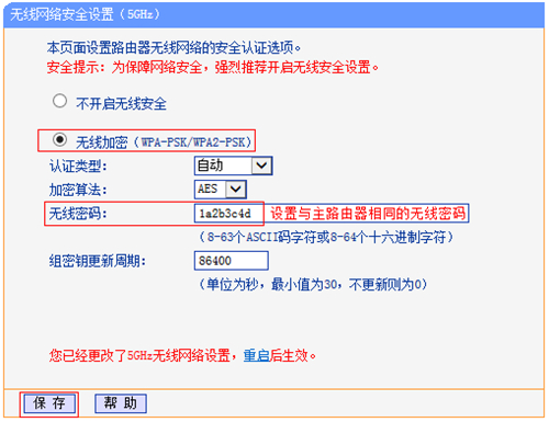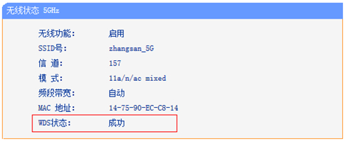 | 第一步:确认主路由器无线参数 确认主路由器的无线信号名称、无线密码以及无线信道,本文使用以下参数举例: 注意:无线桥接(WDS)的主要操作均在副路由器完成,只需固定主路由器的无线信道。 第二步:设置副路由器 1、修改无线参数并开启WDS扫描信号 登录路由器管理界面,点击 无线设置5GHz >> 无线基本设置,修改与主路由器相同的 SSID号,勾选 开启WDS,点击 扫描。 2、选择主路由器信号 在扫描页面中找到主路由器的SSID,点击 连接。 注意:如果扫描不到主路由器的信号,请确认主路由器开启无线功能,且尝试减小主、副路由器之间的距离。 3、选择加密方式并输入无线密码 选择与主路由器相同的 密钥类型,在 密钥 位置输入主路由器的无线密码,点击 保存。无需重启路由器,继续下一步设置。 4、设置副路由器的无线密码 点击 无线设置5GHz >> 无线安全设置,选中 WPA-PSK/WPA2-PSK ,在 无线密码 中设置与主路由器相同的无线密码,点击保存。系统提示“您已经更改了无线设置,重启后生效”,点击 重启,等待重启完成。 注意:副路由器的SSID、无线密码可以与主路由器不同,如果需要实现漫游,则必须与主路由器相同。 第三步:确认桥接成功 重启完成后,在路由器的管理界面,点击 运行状态,观察 无线状态5GHz >> WDS状态,显示 成功 则表示桥接WDS设置成功。 至此无线桥接WDS设置完成,无线终端连接zhangsan_5G即可正常上网。终端移动过程中,可以实现主、副路由器间的自动漫游。 注意:无线桥接(WDS)设置完成后,副路由器只需通电即可,无需其他设置。 |