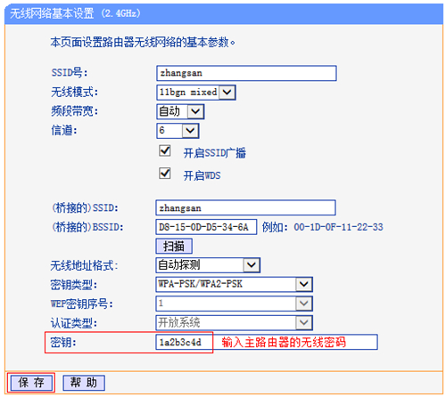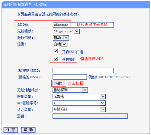 | 第一步:确认主路由器无线参数 确认主路由器的无线信号名称、无线加密方式、无线密码以及无线信道,本文使用以下参数举例: 注意:无线桥接(WDS)的主要操作均在副路由器完成,只需固定主路由器的无线信道。 第二步:设置副路由器 1、修改无线参数并开启WDS扫描信号 登录到副路由器的管理界面,点击 无线设置2.4GHz >> 无线基本设置,修改 SSID号 与主路由器相同,,勾选 开启WDS,点击扫描。 2、选择主路由器信号 在扫描页面中找到主路由器的SSID,点击 连接。 注意:如果扫描不到主路由器的信号,确认主路由器开启无线功能,且尝试减小主、副路由器之间的距离。 3、选择加密方式并输入无线密码 密钥类型 选择主路由器的加密方式,在 密钥 位置输入主路由器的无线密码,输入完成后点击 保存。无需重启路由器,继续下一步设置。 4、设置副路由器的无线密码 点击 无线设置2.4GHz >> 无线安全设置,选中 WPA-PSK/WPA2-PSK ,在 无线密码 中设置与主路由器相同的无线密码,点击保存。系统提示“您已经更改了无线设置,重启后生效”,点击 重启,等待重启完成。 注意:副路由器的SSID、无线密码可与主路由器不同,如果需要实现漫游,则必须与主路由器相同。 第三步:确认桥接成功 打开浏览器,重新登录到副路由器的管理界面。点击 运行状态,观察 无线状态2.4GHz >> WDS状态,显示 成功则表示WDS桥接设置成功。 至此无线桥接(WDS)设置完成,无线终端连接zhangsan,有线电脑连接主、副路由器的LAN口即可上网。终端移动过程中,可以实现主、副路由器间的自动漫游。 注意:无线桥接(WDS)设置完成后,副路由器只需通电即可,无需其他设置。 |
