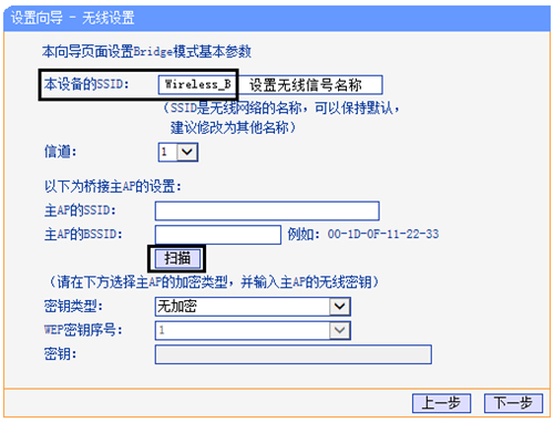 | 一、应用介绍 Bridge(桥接)模式利用设备的桥接功能,与前端无线网络建立无线连接,自身发出新的无线信号,形成新的无线覆盖范围,可以有效的解决信号弱及信号盲点等无线覆盖问题。 二、准备操作 1、确认需要桥接的信号 登录主路由器管理界面,记录无线信号的无线名称、无线密码并固定主路由器的信道,如下图: 注意:Bridge模式主要操作均在迷你路由器完成,只需固定主路由器的无线信道。 2、拨动模式开关 请将TL-WR708N的模式开关拔动到AP模式,并给路由器供电,如下图: 三、设置步骤 1、操作电脑的设置 电脑通过有线或无线方式连接到迷你路由器。 迷你路由器默认不加密,无线信号名称为:TP-LINK_xxxxxx(x为路由器底部标贴标识的MAC地址后六位。 2、登录管理界面 打开电脑桌面上的浏览器,清空地址栏并输入tplogin.cn,回车后页面会弹出登录框。在 设置密码 框中设置管理员密码,并在 确认密码 中再次输入,点击确认。如下图: 注意:如果已经设置好密码,请直接输入管理员密码登录。 3、按照向导设置Bridge桥接模式 进入到路由器的管理界面,点击 设置向导,点击 下一步,如下图: 选择 Bridge:桥接模式,点击 下一步,如下图: 修改 本设备的SSID(无线信号名称),点击 扫描。,如下图: 在扫描页面中找到主路由器的SSID,点击 连接,如下图: 注意:如果扫描不到对应信号,请确认主路由器已开启无线功能,且尝试减小路由器之间的距离。 在 密钥 位置输入主路由器的无线密码,点击 下一步,如下图: 在 PSK密码 中设置迷你路由器的无线密码,点击 下一步,如下图: 注意:迷你路由器的SSID、无线密码可以设置与主路由器不同,如果要实现漫游,则无线信号名称与密码必须与主路由器相同。 点击 重启,弹出对话框点击 确定。 4、设置完成,尝试上网 至此,Bridge模式设置完成。无线终端连接到迷你路由器的无线信号(Wireless_B),有线电脑通过网线连接到路由器的有线接口即可上网。 |