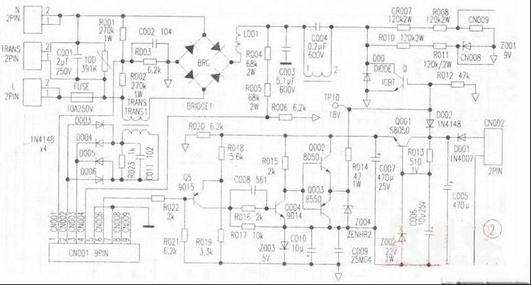 本文介绍一种用单片机控制及采用IGBT高频、高压、大电流开关管的高热效环保电磁炉电路。 主控制电路见图1所示,由电源、单片机(87c1202)、两个LM339及其外围电路组成87C1202为2K内存,8位单片机,其中有两路A/D转换输入,一路②脚用于灶面温度控制,控制温度没为60~250℃(分为5个段)。另一路③脚用于IGBT超温保护,设定温度为83℃。功率自动控制由④脚采样;⑩脚为脉宽输出,控制整机输出功牢;⑨脚为保护输出端,电路如有异常,该脚输出为低电,使逆变输出截上。87C1202还完成自动功率控制,使铁锅与不锈钢锅的功率恒定,电网电压波动时自动调整功率和对火力挡、温度挡、定时挡的控制。还对散热风机、峰鸣讯响及故障代码等进行控制及设定。LM339及其外围电路完成一系列欠压、过压及脉宽方波形成与输出等功能。 图2为主逆变电路,由推动电路和采样电路等组成,IGBT大多根据不同功率(1300w、1600w、1800W)分别采用快捷公司的40N150D和西门子的SKW25N120等。 图3为操作显示电路,由开关键、菜单键、增减键,个3位数码显示管及一个译码电路组成。 表1、表2、表3分别为87C1202、U4(LM339)、U3(M339)的实测静态数据。 该电路已应用于许多品牌电磁灶,如:台湾品牌“正夫人”、澳洲“袋鼠”、广东“美而浦”、“小鸭”、中山“雨泉”、“万升”,“家宝”、顺德“顺胜”等。 |