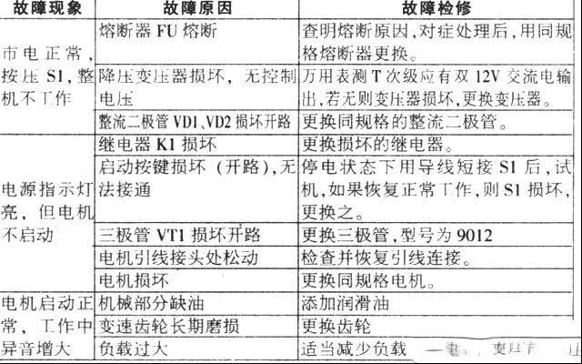 | 恒联食品搅拌机集和面、拌馅、打蛋液等多种功能于一体。现将该搅拌机电路图画出,本文仅供维修人员参考。接通电源,220V市电经熔断器FU分两路,一路直接经继电器K1的常开接点K1-1、K1-2为搅拌电机M供电。当由控制电路控制的继电器K1得电吸合,其常开接点K1—1、K1-2接通时,电机启动运转,带动机械对食品进行加工。 另一路加至降压变压器T初级,次级输出双12V交流电,经二极管VD1、VD2全波整流、电容C1滤波输出正15V直流电作为控制电路工作电源。集成块IC1为控制电路核心部件;14脚为电源正端,④脚为电源负端,⑩脚为启动端,外接启动端按键S1;当按下启动键S1,则⑩脚为高电平,12脚输出低电平,三极管VT1导通,继电器K1得电吸合,其常开接点K1-1、K1-2接通,搅拌电机M启动运转。此时工作指示灯LED1(红)亮。 需要停止工作时,按下停止按键S2,IC1⑧脚为高电平,12脚输出为高电平,三极管VT1截止,继电器K1失电释放,则常开接点K1-1、K1-2断开,切断电源,搅拌电机停止工作。LED2(绿)为电源指示灯。 |