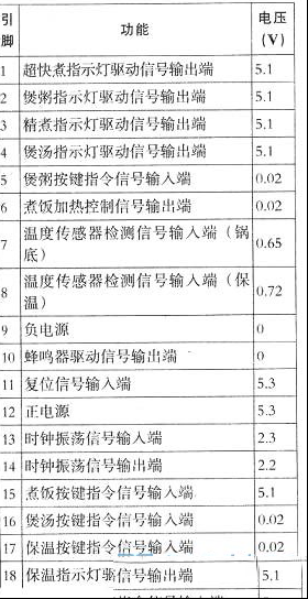 | 此款微电脑电饭煲采用单片微处理器HT46R47(该芯片为18脚双列直插式PDIP塑料封装)对电饭煲进行控制,具有煮饭、煲粥、煲汤和保温等功能,并设置工作模式LED指示灯、蜂鸣音提示和多重安全保护电路。微电脑电饭煲实绘电路如下图所示,整机由保护电路、电源电路、复位电路、时钟振荡电路、锅底温度检测电路、保温温度检测电路、煮饭加热控制电路、按键电路、显示电路和蜂鸣提示电路等构成。 1、保护电路 由超温熔断器FU和压敏电阻RU等构成保护电路。FU串联在市电输入端,当电饭煲出现短路故障或工作温度异常,超过极限温度185℃时,FU就会自动熔断,强制电饭煲断电,起到安全保护作用。RU并联在市电输入端,在市电电压过高或雷电窜入电饭煲时瞬时短路,使FU熔断,起到过压保护作用。电容Cl起抗高频干扰作用,抑制电网中的高频杂波信号。 2、电源电路 220V市电经FU后分成两路,一路经继电器的常开触点K1—1为加热器EH供电。另一路经电阻Rl限流、电容C2降压加至整流桥VD1—VD4整流,由电容C3、C4高低频滤波后,产生12V直流电压为继电器Kl供电。同时12V直接电压经电阻R25降压,电容C5、C6再次高低频滤波,二极管VD5稳压后产生5.3V稳定的直流电压,作为微处理器CPU的工作电源,从CPU(12)脚电源端输入。同时,该5.3V直流电压还为其他控制电路供电。电路中,电阻R12、R5分别是电容C2、C5的泄放电阻,起到保护作用。 3、复位电路 该复位电路较简单。CPU(11)脚为复位信号输入端,采用上电复位方式,当每次上电时给微处理器一个复位信号,使其内部寄存器/定时器进行复位,微处理器各项程序恢复初始状态。 4、时钟振荡电路 由CPU(13)脚、14脚外接晶体振荡器B构成时钟振荡电路。时钟振荡电路产生的基准振荡频率是4.19MHz,基准振荡频率使微处理器各部分电路相互制约,有条不紊地协同工作。 5、锅底温度检测电路 由CPU⑦脚与其外接电阻R21、R19、R23,电容C9、C8及温度传感器RT1等元件构成锅底温度检测电路。RT1为负温度系数热敏电阻,用来检测锅底的温度。当锅底温度变化时,RT1的阻值随之变化,从而转变成变化的电压,将变化的电压信号送人CPU@脚,经微处理器内部转换器进行数据比较,据此得到所测的锅底温度值,微处理器执行煮饭、煲粥或煲汤加热控制程序。 6、保温温度检测电路 由CPU⑧脚与其外接电阻R22、R20、R24,电容C11、C10及温度传感器RT2等元件构成保温温度检测电路。RT2为负温度系数热敏电阻(常温状态下它的电阻值在150kΩ一200kΩ之间),主要用来检测保温温度,将检测到的信号送人CPU(8)脚,经微处理器内部电路处理后,发出断续的加热控制指令,当煮饭、煲粥或煲汤程序结束时,则进入保温状态。 7、煮饭加热控制电路 由CPU⑥脚与其外接电阻R6、R7、三极管VT5、继电器K1、二极管VD6等元件构成煮饭加热控制电路。当CPU⑥脚输出高电平时,该高电平经R2加至VT5的基极,VT5饱和导通,驱动K1吸合,接在电源输入端的常开触点K1-1闭合,220V市电加至加热器EH两端进行加热。并联在K1两端的VD6.是继电器线圈反峰电压释放开关二极管,给线圈的反峰电压提供释放通道,从而保护VT5不被损坏。 8、按键电路 由CPU(15)脚、5脚、16脚、17脚与其外接煮饭键Sl、煮粥键S2、煲汤键S3、保温键S4等元件构成按键电路。按下其中任一按键(对地触发),可向相关脚输入低电平信号指令,经微处理器内部识别电路处理后,执行相应的炊煮程序。 9、显示电路 该显示电路采用发光二极管LED作显示。由CPU①~④脚、18脚与其外接R14LED3,R15、LED4,R2、LED1,R13、LER16、LED5等元件构成显示电路。LED1~LED4分别用来指示精煮、煲汤、煮、煲粥等工作模式,选中点亮。LED5温/待机显示。 10、蜂鸣提示电路 由CPU⑩脚与其外按压电陶瓷蜂HA到地构成蜂鸣提示电路。当按下某按键时或工作模式完成时,⑩脚会输出电压,驱动HA发出短促的提示声。微处理器HT46R47各引脚功能及待机状态下在路电压值见下表,供维修参考。 |