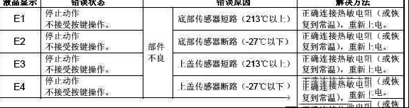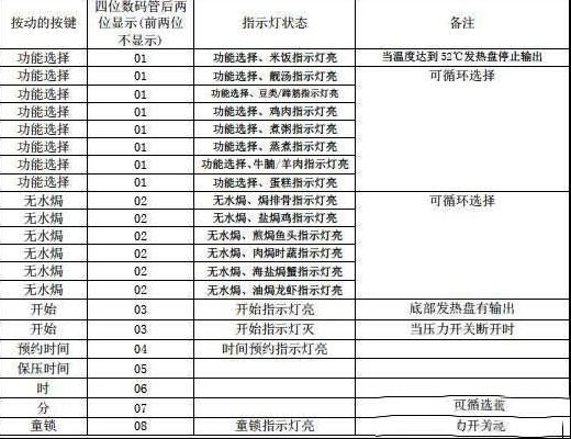 | 一、工作流程上:压力开关第一次跳开(如果热敏电阻感应到锅底温度达到控制温度点,即使这时压力开关没有跳开,也认为进入了压力状态,开始计算保压时间)为保压时间的开始,这时数码显示保压时间,并开始倒计时显示;保压过程中,当压力开关跳开,程序控制停止加热,压力开关闭合,程序控制开始加热(22秒通,10秒断)。在尚未进入保压状态时,数码边缘循环滚动显示。 二、掉电记忆时间2小时,所有烹调工作完成后,蜂鸣器响,程序都会自动进入保温状态,默认保温温度为72℃±4℃。保温最大的时间为12小时,时间到后回到待机状态。 三、奔腾PLFG5005电压力煲进入工厂模式方法 此机在待机状态下同时按住“时”、“分”键,进入工厂模式,这时蜂鸣一声,所有LED 灯\焗排骨\盐焗鸡\煎焗鱼头\肉焗时蔬\海盐焗蟹\油焗龙虾、米饭、靓汤、豆类/蹄筋、鸡肉、煮粥、蒸煮、牛腩/羊肉数码显示全部亮,这时按动相应的键蜂鸣一声,对应的LED 灯继续点亮,其它LED 灯熄灭,按动除“取消/保温”键外其它功能键,均如此; 如果按动“取消/保温”键,取消工厂模式进入待机状态。 四、奔腾PLFG5005电压力煲进入实验模式方法 实验模式的芯片是独立于产品使用的芯片,专门为实验室人员测试饭煲的性能而设定,为减少实验人员测试的工作量。 五、奔腾PFFG4005电饭煲故障代码及自检功能 1、自检功能 待机状态同时按住“预约时间”“分”键进入工厂模式,蜂鸣器响1 声,数码全显示2 秒,全部LED 发光二极管长亮2 秒,然后检测传感器回路,若传感器回路正常时,即没有开路短路。(底部传感位置接50K 电阻,顶部传感器接100K 电阻)应能见到“8888”字样;如果发生开路或者短路则显示相应的代码,按一下烹调键,数码屏显示01,发热盘全功率加热,烹调指示灯闪烁,开始灯亮;当底部温度达到52 度时,发热盘停止加热,烹调时间指示灯、开始灯长亮;再按一下“功能选择”键,数码屏显示02,发热盘全功率加热,烹调时间指示灯闪烁,当底部温度达到120 度时,发热盘停止加热,烹调指示灯常亮,按“时”键数码屏显示03、侧面发热丝全功率加热、再按“分”键顶部发热丝全功率加热侧面发热丝停止加热。按“保温/取消”键退出自检。 2、传感器故障保护 温度传感器故障时,所有的指示灯闪烁,蜂鸣5声,饭煲不能进行任何工作,对任何按键均不响应。一旦进入保护状态,即使硬件故障机修到这里,终于修好值得探讨。,亦不能对任何按键响应。必须在排除故障后重新上电,系统才能复位。 底部传感器短路----E1(数码位中间两个8字段,下同) 底部传感器开路----E2 顶部传感器短路----E3 六、奔腾PFFG5005电饭煲故障代码及自检功能 1、传感器故障保护 温度传感器故障时,所有的指示灯闪烁,蜂鸣5声,饭煲不能进行任何工作,对任何按键均不响应。一旦进入保护状态,即使硬件故障机修到这里,终于修好值得探讨。,亦不能对任何按键响应。必须在排除故障后重新上电,系统才能复位。 底部传感器短路----E1(数码位中间两个8字段,下同) 底部传感器开路----E2 顶部传感器短路----E3 2、自检功能: 待机状态同时按住“预约时间”“分”键进入工厂模式,蜂鸣器响1声,数码全显示2秒,全部LED发光二极管长亮2秒,然后检测传感器回路,若传感器回路正常时,即没有开路短路。(底部传感位置接50K电阻,顶部传感器接100K电阻)应能见到“8888”字样;如果发生开路或者短路则显示相应的代码,按一下烹调键,数码屏显示01,发热盘全功率加热,烹调指示灯闪烁,开始灯亮;当底部温度达到52度时,发热盘停止加热,烹调时间指示灯、开始灯长亮;再按一下“功能选择”键,数码屏显示02,发热盘全功率加热,烹调时间指示灯闪烁,当底部温度达到120度时,发热盘停止加热,烹调指示灯常亮,按“时”键数码屏显示03、侧面发热丝全功率加热、再按“分”键顶部发热丝全功率加热侧面发热丝停止加热。按“保温/取消”键退出自检。 |
