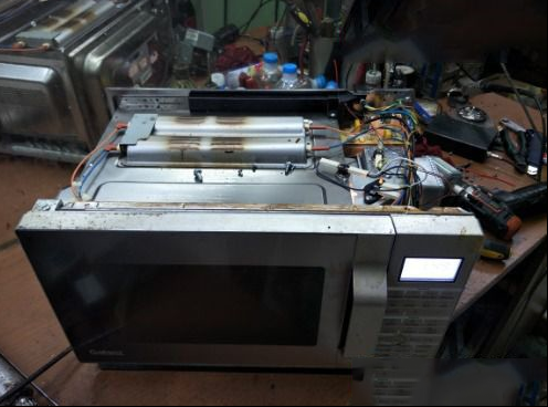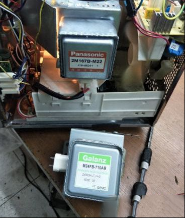 | 收到同行送来的故障机壹台格兰仕G90F25CSLVⅢ-C2(G0)微波炉,此机器开机启动后6秒显示E1,查阅了一下网上资料,众说纷纭,有的说磁控管坏,有的说变频板坏,按照先简后繁的维修原则,找了一个普通松下磁控管装上去,试机10分钟正常。其实变频微波炉可以用普通的磁控管;当然,如果有条件换原装的的更好。 |