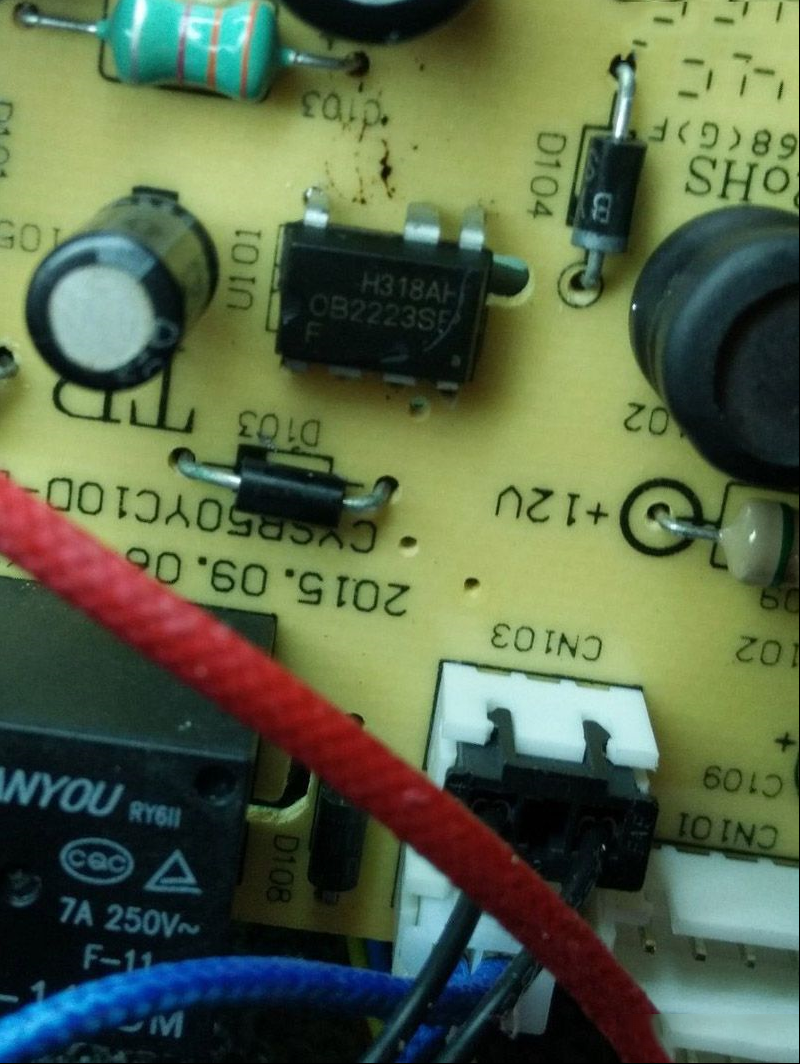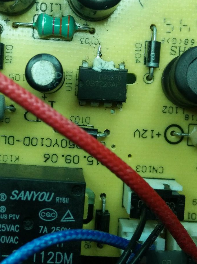| 收到同行送来的故障机壹台苏泊尔压力锅,故障表现为不通电,拆开发现电源芯片OB2223SP已经炸开,由于手头上没有OB2223SP这种芯片,也没有用过。手头上有OB2226AP,上网查资料有的说能直接代换,有的说不能用。只有自己实验才能得出结论,首先看了一下OB2226AP的原理图和OB2223SP的线路图一样,只不过OB2226AP比OB2223SP多了一个引脚,用的时候可以把7脚的引脚焊到8脚上,也可以直接把7脚的引脚剪掉。 |