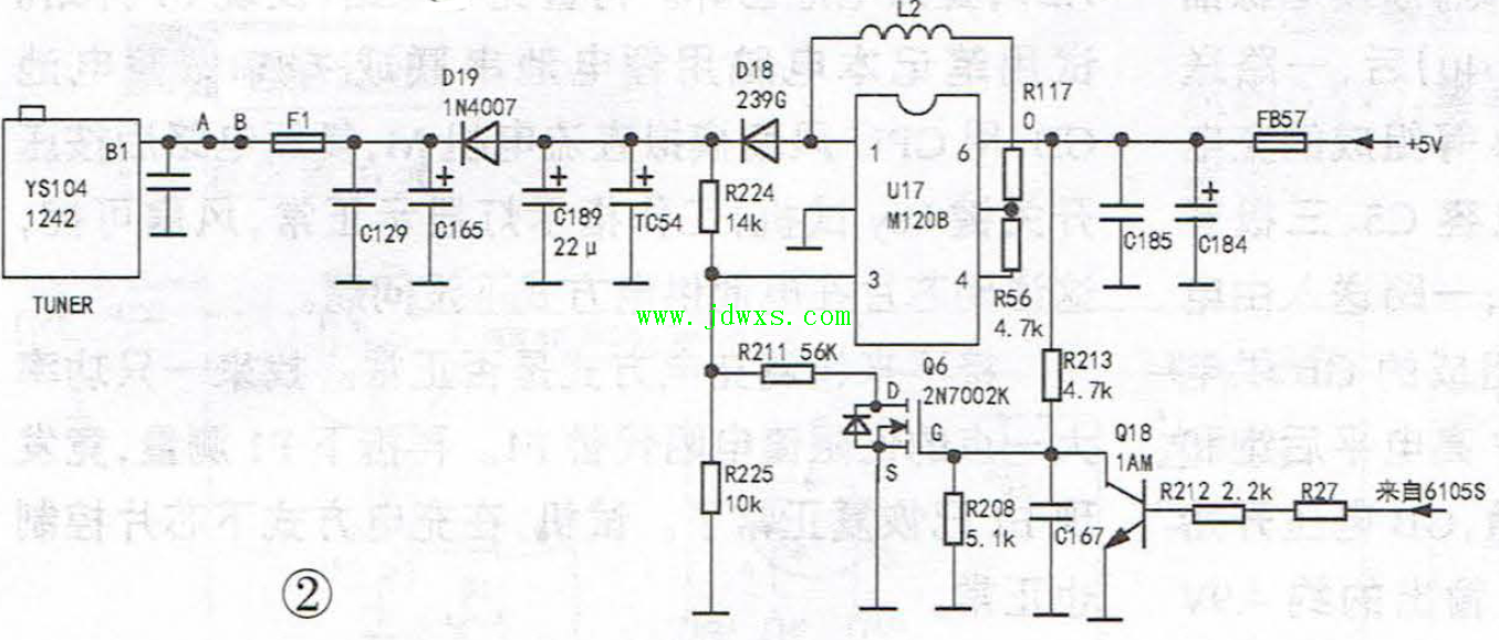 | 海信DB625S-CA19中九卡机无信号强度和质量显示的故障检修收到同行送来的故障机壹台海信DB625S-CA19二代村村通卫星接收机(俗称卡机),机主称:因馈线外皮破裂,雨水进入机器内,引起接收机无信号强度和质量显示。接上室外单元通电试机,发现确实无信号强度和质量,将机器拆开并取下调谐器上盖,用万用表测量其B1脚(flrLNB供电)电压,如图1所示,发现其电压仅在O.38V-0.42V间波动,这说明极化电压异常。 海信DB625S-CA19二代村村通卡机极化供电如图2所示,主要以DC/DC升压型开关电源芯片U17(M120B)为核心组成,5V经保险电阻FB57、C184和C185滤波后一路送至M120B的⑥脚,另一路经R117送到⑤脚,在储能电感L2和续流二极管D18(239G)配合下将5V升到13V或18V,然后经C189、TC54滤波、D19(1N4007)隔离,最后经保险管F1送至调谐器B1脚,再经过F头送到室外LNB单元。M120B的③脚电压决定输出电压的高低。该脚电压由输出电压经R224、R225和R211分压获得。当机器接收左旋节目时,主芯片GK6105S相应引脚输出低电压,此时Q18处于截止状态,5V电压经R213和R208分压后使N沟道场管Q6(2N7002K)栅极电压约为2.6V,Q6导遇,R211与R225并联,M120B的③脚电压为O.59V,这时输出的极化电压约为18.1V;当机器接收看旋节目时,GK6105S相应引脚输出高电压,Q18导通,Q6截止,M120B的③脚电压为O.6V,这时输出的极化电压为13.1V左右。用万用表检查发现F1处极化电压正常,断电后用电阻挡测量发现F1到调谐器B1间(即图2中A、B之间)有断路现象,并且断路点被调谐器覆盖。由于拆除调谐器比较麻烦,所以直接在PCB板反面"飞线",如图3所示。再次开机测量,发现极化电压已恢复正常,不过执行自动搜索时总是无法下载全部节目,考虑到当时正在下雨导致信号弱,于是手动依次搜索11920L28800、11960L28800、11980R28800、12020R28800和12060R2880。这五组转发器参数后,52套节目全部正常,至此故障机修到这里,终于修好值得探讨。。 |