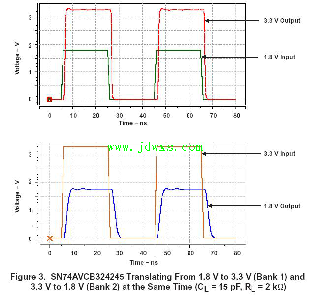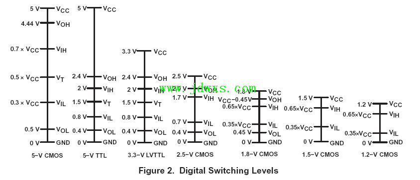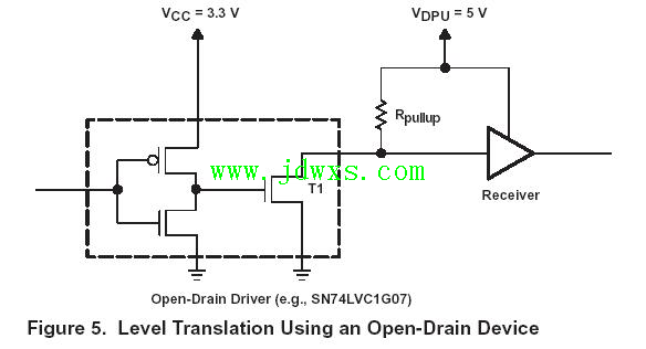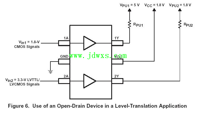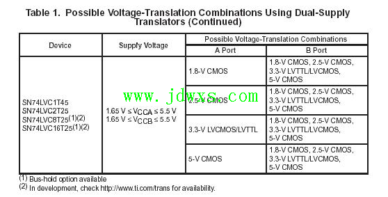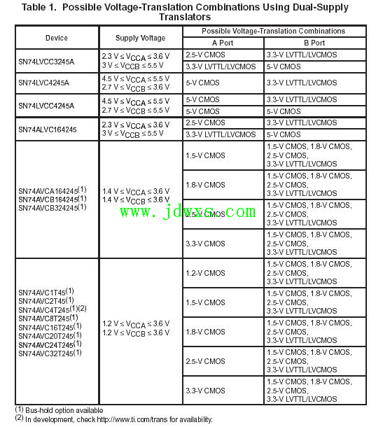 | 1. 简介 在今天的电子电路系统中电压电平的转换基本成为了必须。例如:一 个ASIC的供电为VccA,而I/O器件的供电为VccB。为了使它们之间正 常通信,就需要一个如图1的电平转换(level-translation)方案。 输入电平限值和器件的输出电平主要根据器件采用的工艺技术和供电 。图2显示了不同的供电和元件技术的限值范围。为了成功的实现两个 器件的接口,一定要保证以下的条件: ■ 驱动器件的Voh必须大于接收器件的Vih ■ 驱动器件的Vol必须小于接收器件的Vil ■ 驱动器件的输出电压范围不能超过接收器件的可容忍的I/O电压范围 2. 双电源电平转换器件(Dual-Supply Level Translators) 2.1 特性 双电源的器件是为了满足两类总线或不同供电器件之间的异步通讯的 。这类器件采用双电源:VccA为A端(A side)供电,VccB为B端供 电。对于数据从A到B或B到A都能传输的双向的电平转换器件,方向 取决于输入pin DIR的逻辑电平。如果器件有OE控制,在OE有无效时 A端和B端的总线隔离。 TI的双电源器件有各种位宽的应用并几乎覆盖了当前出现的全部的供 电应用。这些器件灵活,易用并能实现双向转换,对于许多电平转换 的应用都是理想的选择(译者注:强!)。它们的电流驱动能力可以 使其适合长线及重载的应用。 SN74AVCB324245是一种32位双电源电平转换器件(由四组8位端口 组成)。图3显示了SN74AVCB324245的1.8V转3.3V的一个端口,同 时另一个端口实现3.3V到1.8V的转换。 双电源器件的优点: ● 可以在不同电压结点间灵活的转换 ● 具有电流驱动的能力 ● 具有不同的位宽 2.2 产品列表 表1汇总了TI的双电源产品。 从2004一月起TI为其双电源产品实行了一种非常容易理解的 命名规则。图4描述了SN74AVC8T245的名称解析。 3. 开漏输出器件 具有开漏输出的器件是指在输出和地之间有个N沟道的三极管(T1) 。如图5,这些器件可以用于电平转换的应用。输出电压由VccB决定 。VccB可以大于输入高电平电压(up-translate)也可以低于输入高 电平电压(down-translate)。 开漏器件对于各种电压节点间的电平转换非常有用。但是,这种电平 转换的方法存在一些缺点。例如,当输出电平为低时,N沟道三极管是 导通的,这样在VccB和GND之间有一个持续的电流流过上拉电阻 Rpullup和三极管T1。这会影响整个系统的功耗。 采用较大值的上拉电阻可以减小电流。但是,但是大的阻值会使输出 信号的上升时间变慢。开漏输出器件的优点如下: ● 可以用于各种电压节点的Up-translate和down-translate转 换 ● 可以用于“线与”方式 3.1 应用举例-应用SN74LVC2G07实行电平转换 图6显示了SN74LVC2G07一个Buffer作1.8V到5V的转换, 其它的作3.3V到1.8V的转换。 |