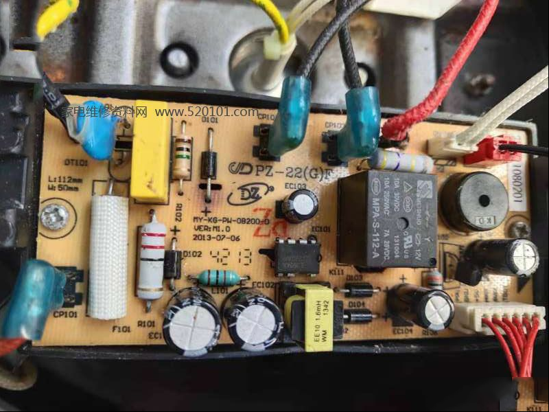 | 收到同行送来的故障机壹台美的MY-12CS502A电压力锅,通电试机显示C6,网上查询资料说C6代表的是压力开关的故障,属于通病故障,于是进行拆机,首先检查压力开关并没有损坏,顺着压力开关一查R191 470K开路,更换R191电阻后故障修复。 |