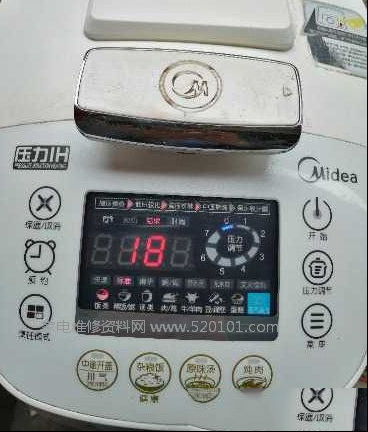| 收到同行送来的故障机壹台美的MY-HT5079电压力锅,故障表现为通电按菜单开始,瞬间加热一下,加热显示框一直转,2分钟后结束。拆开压力锅,检查大电阻和5uF电容,板上未见异常。最后查出故障原因是上盖传感器阻值变得过小造成的,这个应该是美的电压力锅的通病。 |