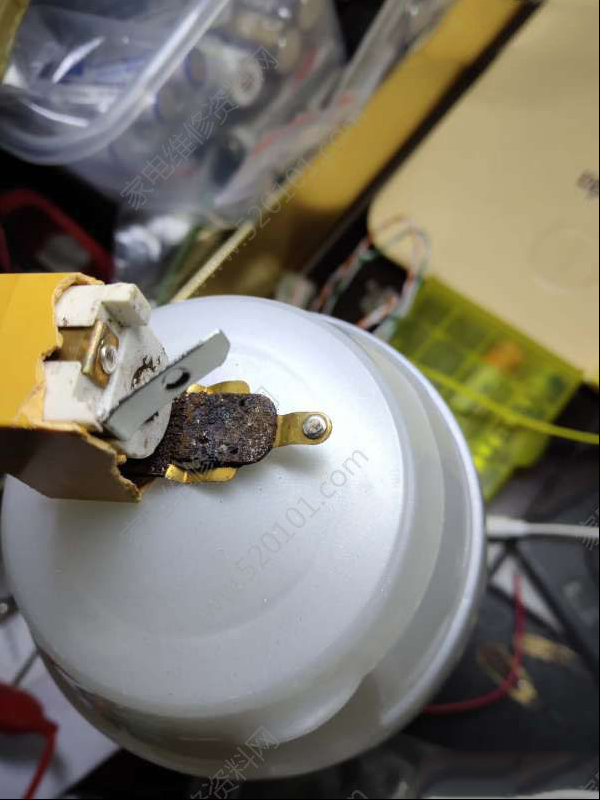 | 一用户送来收到其他维修同行的一台九阳豆浆机,说用了几年了,今天出现了什么程序都没有,没有正常的加热和打碎的声音。打开豆浆机,电源板电压正常的5V有,滴滴声正常,按键有反应,跑线路发现继电器控制总电源给2个可控硅,继电器在程序开始时有12V给线圈,但是没有吸合的声音。拆下发现继电器已经不正常,拆开继电器,发现其防锈没有做好,生锈的铁碎顶住。更换继电器后故障修复。 |