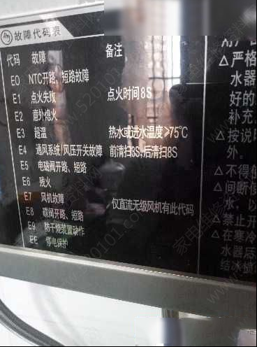 | 上门维修收到其他维修同行的一台“CBAO"千禧厨宝牌燃气热水器,故障表现为试机提示E7故障代码,打开面盖一看,热水器虽然是杂牌但是做工很不错,用料十足,其内部无风压,启动容电等易损配件。从开机到出现E7时,直流风机一直不转,查主板输出到风机的DC24v供电正常,判断风机损坏。折开风机检查线圈正常,上电查风机板子上有24v供电,7805贴片无电压输出,用电烙铁更换后故障机修到这里,终于修好值得探讨。。 |