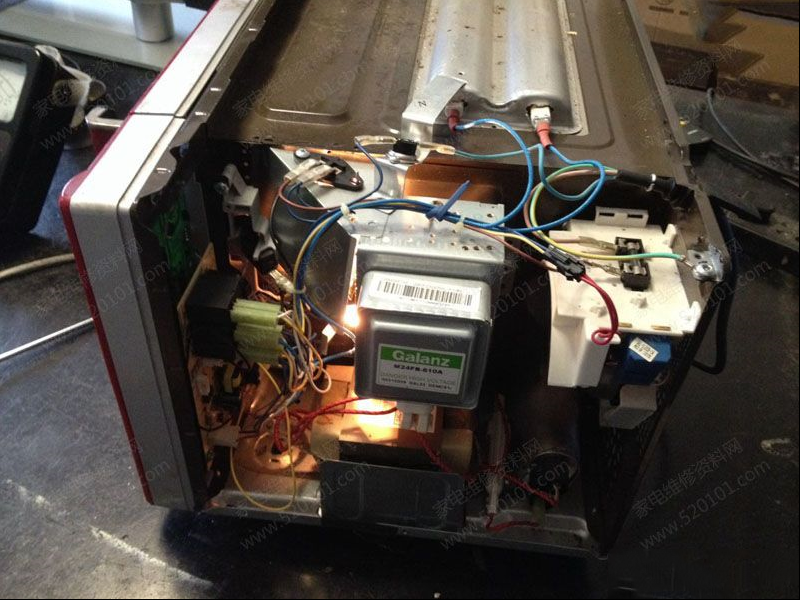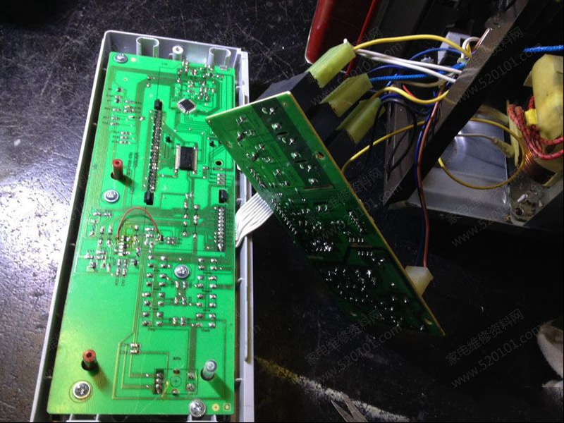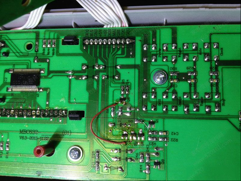 | 收到同行送来的故障机壹台格兰仕G80F23DCN3L-F7(R0)微波炉,故障表现为试机不加热,所有操作一切正常,风机也不转,怀疑电脑板坏。于是拆机对微波炉门开关检查发现门开关是好的,由于风扇,烧烤,微波管供电都是通过继电器由电脑板发出控制指令进行控制,于是对继电器控制电路进行检查。 发现无论开启微波还是烧烤图片中Q6三极管基极始终没有电,这个三极管基极供电来至Q1。检查Q1基极5V射击5V,这是一个PNP三极管,只有当基极低于射击0.7V他才会导通,这个三极管受控于电脑板上面一个四排电压逻辑转换芯片。 通过测试无论微波烧烤这个芯片控制Q1三极管基极脚没有电压变化,本人认为这个芯片可能该脚已经损坏,网购查了一下看来这个微波炉电脑板还有点贵,再加上现在去年要过年的时候快递也忙。于是分析电路后决定用导线将Q1三极E级接入C级,这样当微波炉关门后风机就会转动,由于考虑到用户烧烤用的少,于是将微波控制信号同时控制风机继电器三极管(按照图片接线),其实我过后想也可以将电路改好烧烤风机也可以转动。 这个电路工作原理是这样的:就是当开启微波或者烧烤或者微波烧烤同时开启时候,三极管Q1基极就受前面逻辑芯片一个低电平控制,于是让集电极输出5V电压,这个电压一个给风扇继电器三极管基极提供偏值让其导通,风机马上转动,同时又给烧烤继电器三极管射击供电,让烧烤微波继电器三极管处于待命状态。当微波烧烤三极管得到高电平电压的时候就导通,这种设计其实就是当风机不转的时候,微波和烧烤是不会工作的,只能说这是一种保护性设计电路,我感觉我改了电路后这种保护没有了,不过我想原来的微波炉没有这样设计也还是在用。 |