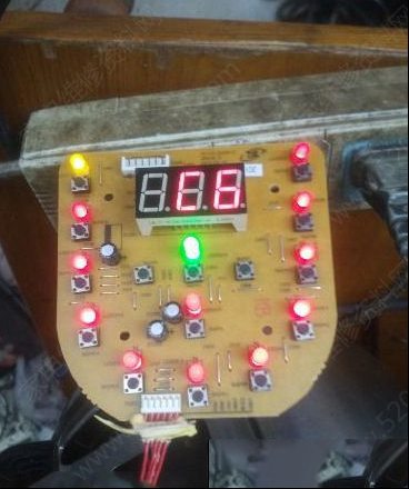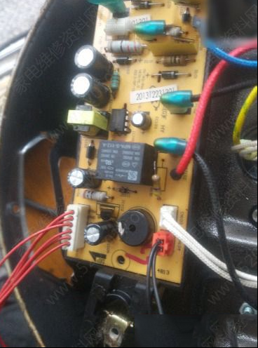 | 最近收到同行送来的故障机壹台美的电压力锅,故障表现为通电显示L-J代码(客户送修时无内锅无盖),保温黄灯亮,操作任何键都无反应,死机故障。开盖检测查面板5V供电正常。习惯性的凭经验三下五除二打开操作面板,一番检测后无果,目光再次移至电源板,发现有一组2黑线通至锅外壳的顶部,此时才恍然大悟。(拆之前还特意看了锅外壳顶端没有黑色圆柱凸起开关,至此维修走了弯路) 由于此机采用了干簧管代替了常见的锅盖到位检测机械开关,临时短接此插座,代码消失。但出现C6代码(真正故障),这个就轻车熟路了,直奔470K大电阻,断开一脚测量电阻为100K多点,目测有油污及水汽在电阻位于线路板接触面,用餐巾纸擦除干净后,上机恢复电路一切正常,故障修复! |