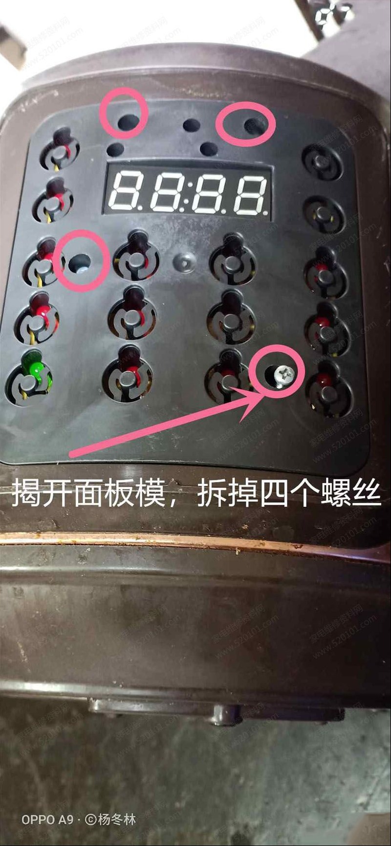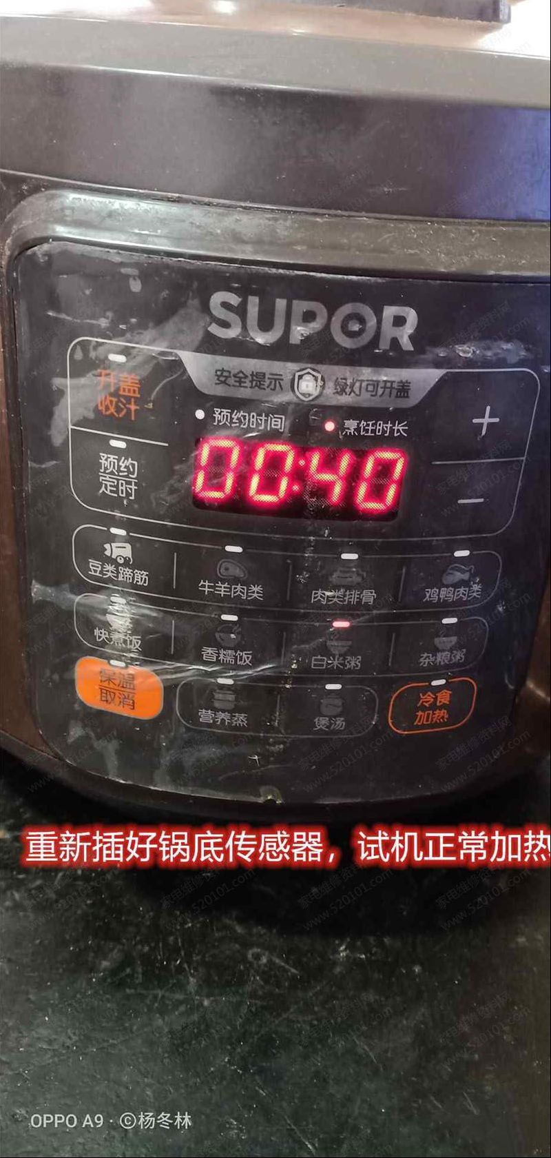 | 客户送来收到其他维修同行的一台苏泊尔CYSB50YCW10D-100全智能电压力锅来我维修部,故障表现为是通电启动立即显示E1故障代码,由于这种电压力锅电路板装在面板上,所以要先揭开面板模,才能取出电路板,如下图所示。 翻转电路板时,发现锅底传感器插头松动了,相当于感应器开路了,所以才显示E1情况。 实测锅底传感器是180K正常(由于环温底引起阻值增大,事实是环温25度100K的感应器) 重新插上锅底传感器接头,通电测试机子正常加热。 |