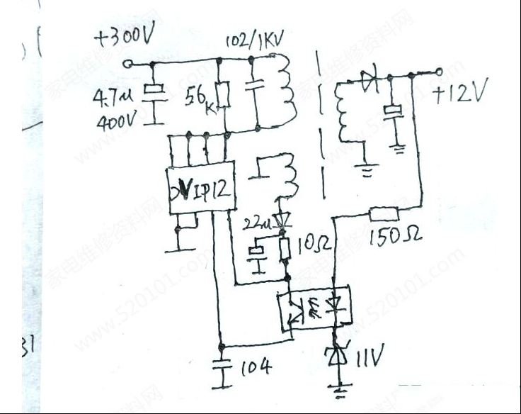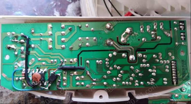 | 收到同行送来的故障机壹台飞利浦HD4744电饭煲,故障表现为不通电。首先拆机检查热保护元件完好,拆开电源板发现烧坏元件有一只1mH电感,一只4.7u/400V电容,一只13002,还有一个微形贴片6脚集成块。损坏的元件中,6脚贴片微型元件表面炸飞,不知型号。 决定改装电路,找出一个电磁炉用电源模块(只需改动一只元件,就可使其输出变为12V),但转念一想,电磁炉模块是热地,而原机电源设计为冷地。何不用常用的Vip12A改电路代替!可能有些师傅会采用更简单的方案,就是用10V的小变压器来改,我之所以不用这种方法,是觉得变压器体积较大,要另找地方安装固定。 于是画出Vip12A的电路图,拆除原电源部分的电阻,保留变压器及整流部分,将Vip12A焊在拆了电阻的焊点上,划开不用的电路,焊线到相应电路板的焊点,817反向放在Vip12A旁边,连接好线路(没有找到11V的稳压管,用1N4742),通电测输出为12.8V,完全达到改装要求。接上灯板,按键功能正常,装机烧水试锅约30分钟保温。 |