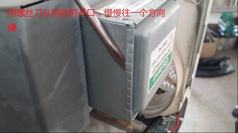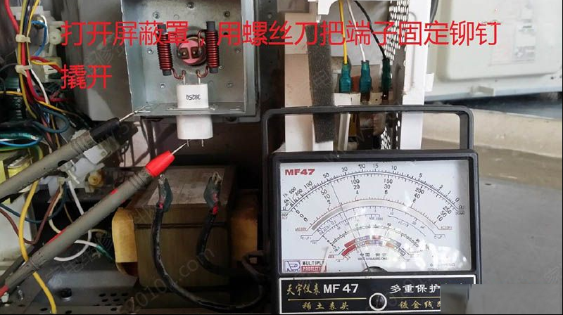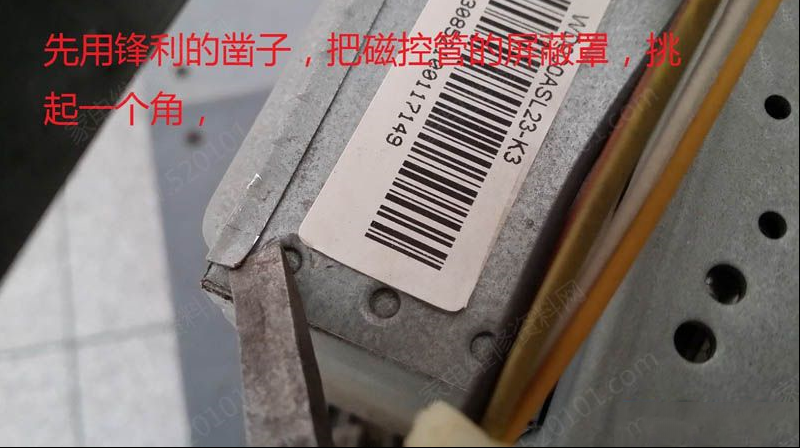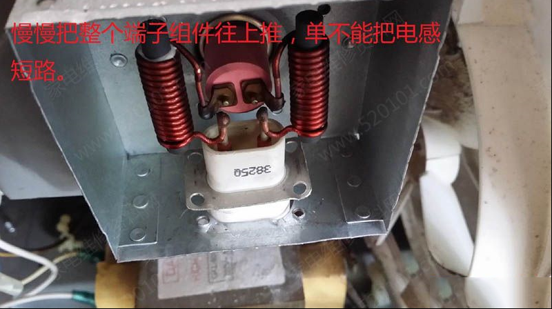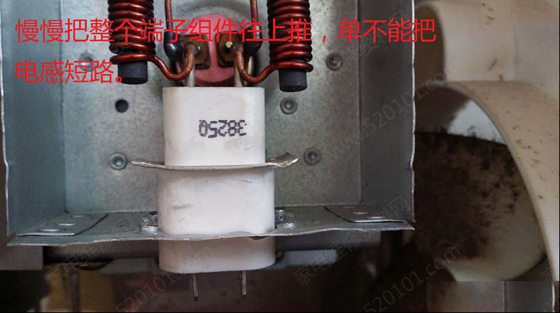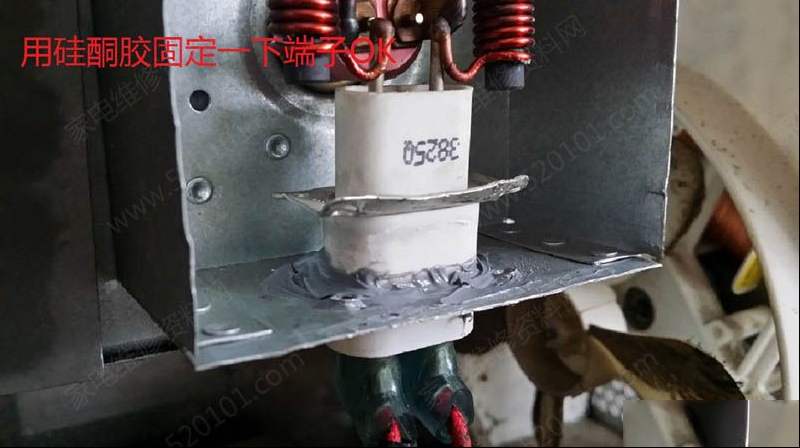| 我们在维修微波炉的时候,经常会碰到微波炉磁控管高压端子漏电的现象,遇到这种情况,要不就换端子,要不就换磁控管。换端子没有专业的碰焊设备弄不了,换磁控管维修成本太重,客户接受不了。在这里我介绍一个低成本的维修方法跟大家分享,已经应用在上百台成功案例,绝对好用,具体请看下图。 这台微波炉,测得高压端子漏电,等待手术 先用锋利的凿子,把磁控管的屏蔽罩挑起一个角 用螺丝刀从挑起的开口,慢慢往一个方向撬 打开屏蔽罩,用螺丝刀把端子固定铆钉撬开 慢慢把整个端子组件往上推,但不能把电感短路 慢慢把整个端子组件往上推,但不能把电感短路 用硅酮胶固定一下端子之后就可以了 最后把屏蔽罩安装好 微波炉加热试机一切正常 |