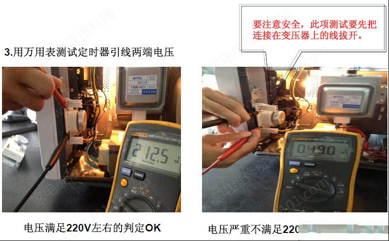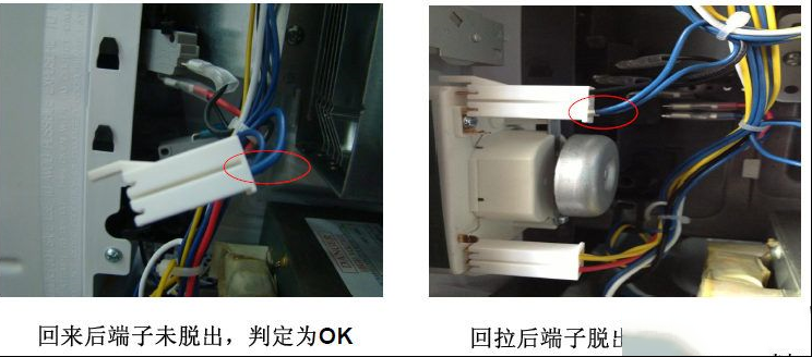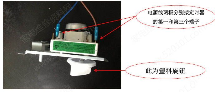 | 一、定时器维修判定流程 二、观看旋钮位置 如果旋钮到边的距离偏小,有可能因为干涉导致卡死 间隙不均匀,会存在旋钮用控制盒之间摩擦导致卡死,维修方案:在经过以下几点确认后定时器合格后,调整间隙达到均匀状态,上紧螺丝。 三、观看定期器插线情况 如果端子从护套内脱出,则会出现定时器时转时不转。确认方法:用手稍用力回拉一下线,看是否能把线拔出。 维修方案:将端子重新传入护套后重新插上定时器 四、用万用表测试定时器引线两端电压 维修方案:插片线束端子是否有压处线皮,不完全导电的现象。若有,重新焊接端子 五、用万用表测试定时器引线两端电阻 测试定时器引线两端,若电阻为18KΩ左右,判定为OK;测试若显示电阻很大或者无穷大,判定NG 维修方案:若测试无电阻的产品,更换定时器 六、若定时器在某一位置卡住,请不要拧动旋钮,将定时器从塑料控制盒上面拆下来,如下图方式用电源线接定时器上的两个端通电测试 测试定时器若能自动归零,则此定时器OK 维修方案: 1.若自动归零,则检查塑料旋钮上是否有塑料披风,若有,将批峰割除 2.若不能自动归零,则更换定时器 |