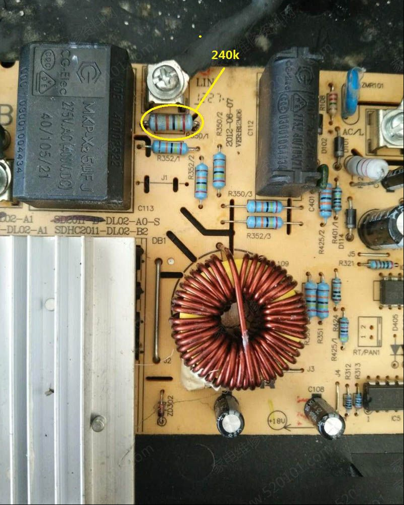 | 收到同行送来的故障机壹台电磁炉无法加热,显示代码E0,查资料系内部电路故障;电压测量大电阻r3501上压降256v系该电阻变质电阻增大,造成后面电压严重下跌,取样电压不足。无法加热,该电阻为240千欧,找不到相同功率电阻,用一支240千欧一瓦替换,E0立刻变为E1,可以正常加热。 |