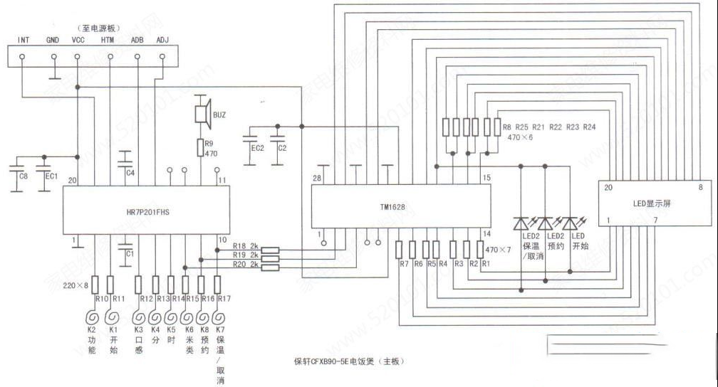 | 收到其他维修同行的一台保轩CFXB90-5E智能电饭煲,在加热过程中常会跳掉不加热。通电试验,电饭煲在加热一定时间后显示E4代码,并有提示音。断电,再重新通电开机,故障表现为仍不定时出现,并且发现在开机时开关电饭煲锅盖的话,屏幕也会显示E4代码,并有提示音。根据这个现象查看电饭煲电路(整机实测电路如图1、图2所示),看到锅盖与主板之间并没有开关连线,只有锅盖内的温度传感器与主板的连线。测量出是锅盖温度传感器与主板的连线有断裂接触不良的情况,将断裂的连线连接好并做好绝缘。再开机试验数小时,故障未出现,电饭煲修复。 最后总结:电饭煲锅盖内的电路与主板的连线在锅盖转轴铰链处断裂是常见故障,修复的话,可以重新接通导线。需要注意的是,重新连接处要用有弹性的热缩管或硅胶做好绝缘。 |