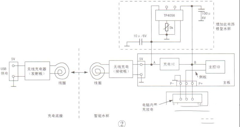 | 收到故障机一只Gululu 智能水杯,放到无线充电底座上时,无线充电底座的待机指示灯熄灭,但水杯的屏幕不亮,也没有任何提示音。揭开杯底的灰色胶垫,拆下固定螺丝,可见无线充电接收板、磁感应线圈、锂电池等元件(如图1所示)。 拔下无线充电接收板与主板的连线,把水杯放在无线充电底座上,测量无线充电接收板的输出电压为5V,说明无线充电接收板输出电压正常。拔下主板上锂电池的连线,测量锂电池插座P+、P-端之间电压为0V,明显异常。拆开电池外部塑料纸,发现电池内置充放电保护板。测量保护板上B+.B-端间电压为2.87V,看来电池的电芯不一定损坏。将无线充电接收板和锂电池的连线都与主板连接好,再把水杯放到无线充电底座.上,测量无线充电接收板的输出电压仍为5V,但锂电池插座P+、P-端之间电压为2.07V,保护板上B+、B-.端之间电压也仍为2.87V,看来主板上的锂电池充电控制电路有问题,使其输出电压只有2.07V,导致锂电池电芯欠充电,锂电池内置充放电保护板起控关断了输出,水杯电路失电不工作。电路框图如图2所示,无线充电接收板的输出电压5V端(A点)与一只6脚芯片的④脚相连,而锂电池的P+端(B点)与芯片⑥脚相连。 从线路走向看,该芯片应是充电控制IC。在路测量该芯片各脚对地阻值无短路现象,怀疑芯片内部功率管劣化导致输出电压偏低。外接一块TP4056锂电池专用充电板试验(A点接TP4056充电板的输入端,B点接TP4056充电板的输出端,TP4056充电板的地接主板地),水杯能自动开机,且屏幕上显示充电进度条,如图3所示。 在充电过程中,测量电池插座P+、P-端及电池保护板上B+.B-端之间电压均在同步上升,看来故障原因是主板上充电芯片损坏。.由于杯内空间有限,于是笔者对TP4056充电电路进行简化(充电电流设为400mA),并飞线连接,如图4所示,通电测试机子,故障机修到这里,终于修好值得探讨。。 该水杯无线充电底座实绘电路如图5所示,充电底座由芯片STM8S003F3P6控制。该芯片采用四只场效应管Q1~Q4组成全桥电路,在5V低电压情况下提供较大功率输出,以推动感应线圈COIL产生磁场。水杯底部的感应线圈输出感应电压送给无线充电接收板,输出5V电压供给主板。 同时,无线充电接收板电路给水杯底部的感应线圈输出通讯数据,表示电路工作状态。充电底座的感应线圈感应到的数据电压经过运放放大后送给芯片③脚,芯片发出指令:待机LED熄灭,Q1~Q4推动感应线圈产生正常的磁场。电阻R1的压降正比于Q1~Q4的工作电流,此压降经运放放大后送给芯片⑨脚,芯片以此调整Q1~Q4的驱动脉冲脉宽,以稳定感应线圈产生的磁场大小。当水杯中的无线充电接收板的5V电路过流时,芯片③脚检测到这一异常信 号后会发出指令, 待机LED闪烁,并且控制Q1~Q4进入低功率输出状态,以避免电路损坏。 |