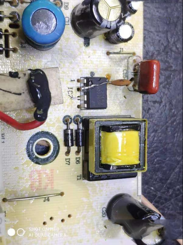 | 收到故障机一块三洋洗衣机的板子,由于12V整流二极管短路烧坏了芯片OB2212A,还有电阻R3,R17分别1.8欧,300欧,换了,由于手里没有现成的OB2212A,查图纸对比发现芯片和我手里有的OB2226差不多,于是对照图纸,将OB2226的2、3脚不插入电路板,2脚对地接入一个104电容,原电路板1脚外围1脚1k电阻用导线短路,开机电源输出18V,板子正常工作,但是担心不长久,查阅资料没有发现OB2226改电压的地方,先这样用吧。 |
