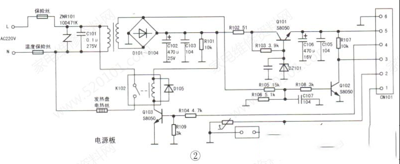 | 收到同行送来的故障机壹台苏泊尔CFXB40FD11-75(SFO0354)电饭煲,故障表现为是通电后无显示,也不能加热。实绘该机主板及电源板电路如图1、图2所示。经检,锅底温度传感器(俗称磁钢)内部的温度保险丝开路。将磁钢整体更换后通电,按压按键,指示灯有反应,但是在“烧煮"模式下,给发热盘电热丝供电的继电器不吸合,只有选择“保温"时继电器才吸合,怀疑CPU有故障。 查询资料得知,部分智能电饭煲的CPU在开机后先检测锅内食物温度,一段时间后才开始加热。上电试验,该电饭煲的继电器在开机约1min后自动吸合,加热正常,这种延时自动现象望网友们注意,以免误判。 |
