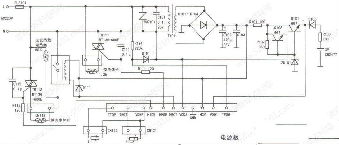 | 收到同行送来的故障机壹台美的FZ5012B(MB-FZ50PB)电饭煲,上电后经常显示“C1”或“C3”故障代码,无法加热,有时又能正常加热。检查锅底和锅盖温度传感器都正常。因该电饭煲的电脑板与电源板靠近锅体,工作环境温度较高,所以怀疑这两块板上的电解电容长期受热性能劣化。这两块电路板的实绘电路如图1、图2所示。 更换电源板上的滤波电容C102,电脑板上的VDD1滤波电容C201及VDD2滤波电容C203后试机,故障机修到这里,终于修好值得探讨。。该机使用了大半年后故障再现,怀疑上次换上的普通电解电容长期受热性能劣化。将C102、C201、C203换为耐高温(105°C)、低ESR的三洋优质高频电解电容后试机,电饭煲在冷机时加热正常,但是在锅内的水沸腾后仍会出现C1故障代码,查锅底和锅盖温度传感器仍都正常。 由于在锅内无法检测线路板元器件,故把线路板拆下移至锅外。常温(25°C)下50k温度传感器在100°C时阻值是3.3k,在90°C时是4.4k。于是在不接原温度传感器的情况下,在线路板TTOP端口对VREF端口接一只4.4k固定电阻,在线路板TBOT端口对VREF端口接一只3.3k 固定电阻,以模拟高温下输入CPU的电压。此时实测CPU③脚电压是2.3V,④脚电压是2.7V,主板没有显示故障代码。 试着用吹风机加热主板,过了一段时间线路板就发出报警声,液晶屏显示C1代码。测量TBOT端口电压为2.7V不变,而CPU④脚电压为0V,查出是R222贴片电阻有虛焊。补焊R222后并恢复原接线试机,电饭煲故障代码不再出现,故障机修到这里,终于修好值得探讨。。 |